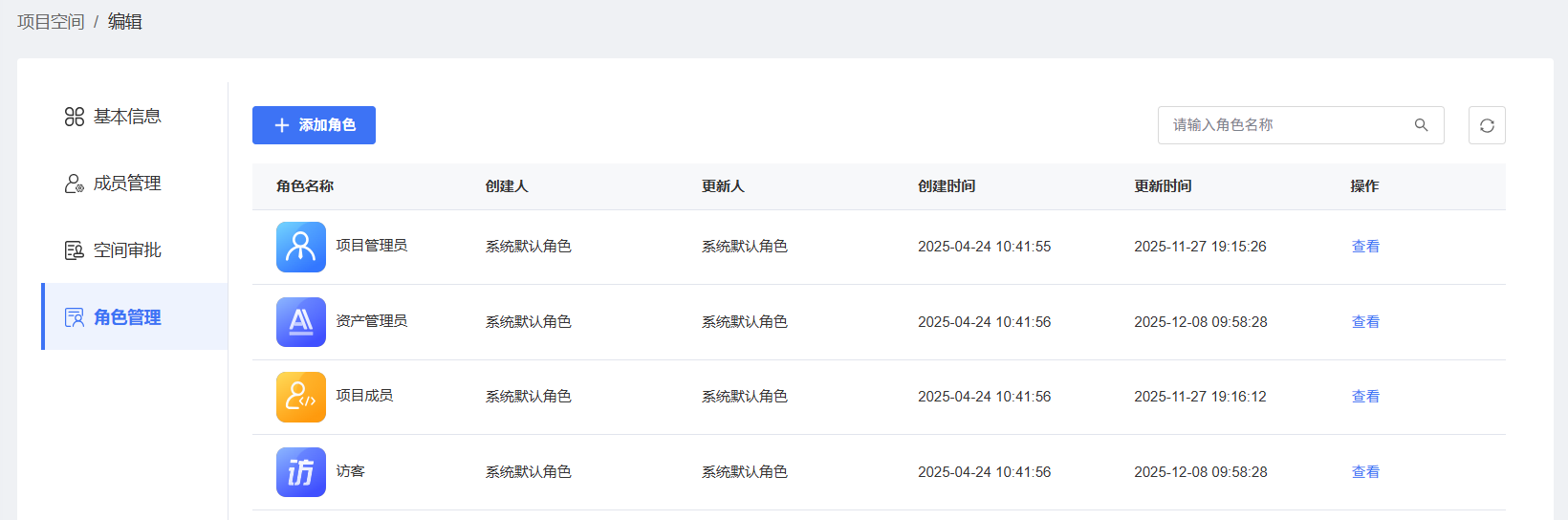 系统默认角色:系统会自动为项目空间创建【项目管理员】、【资产管理员】、【项目成员】和【访客】四种系统默认角色。可以单击【查看】系统默认角色基本信息和权限信息,系统默认角色不支持编辑和删除。