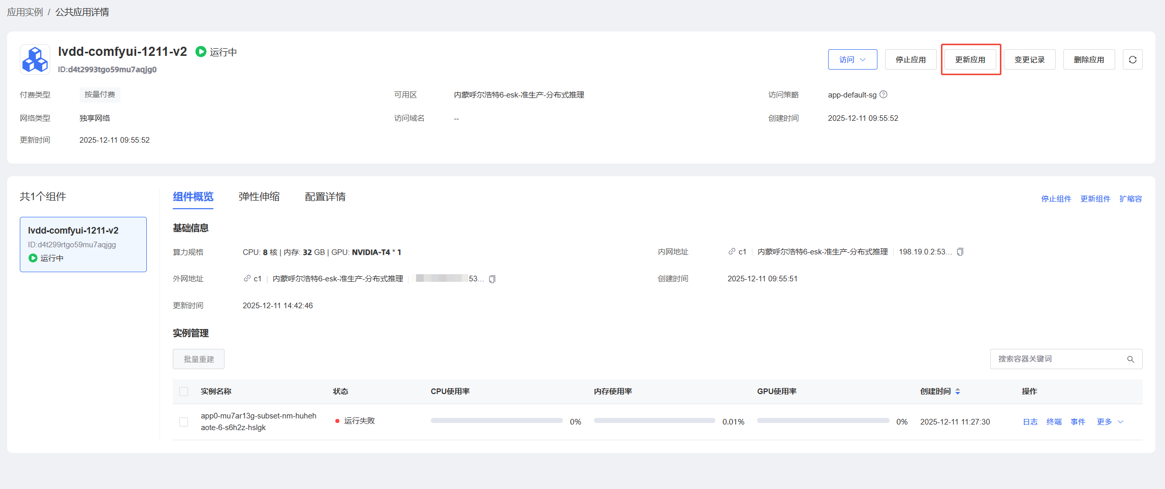 通过【应用实例】创建的自定义应用,资源类型为独享资源的应用,具体更新参数如下。