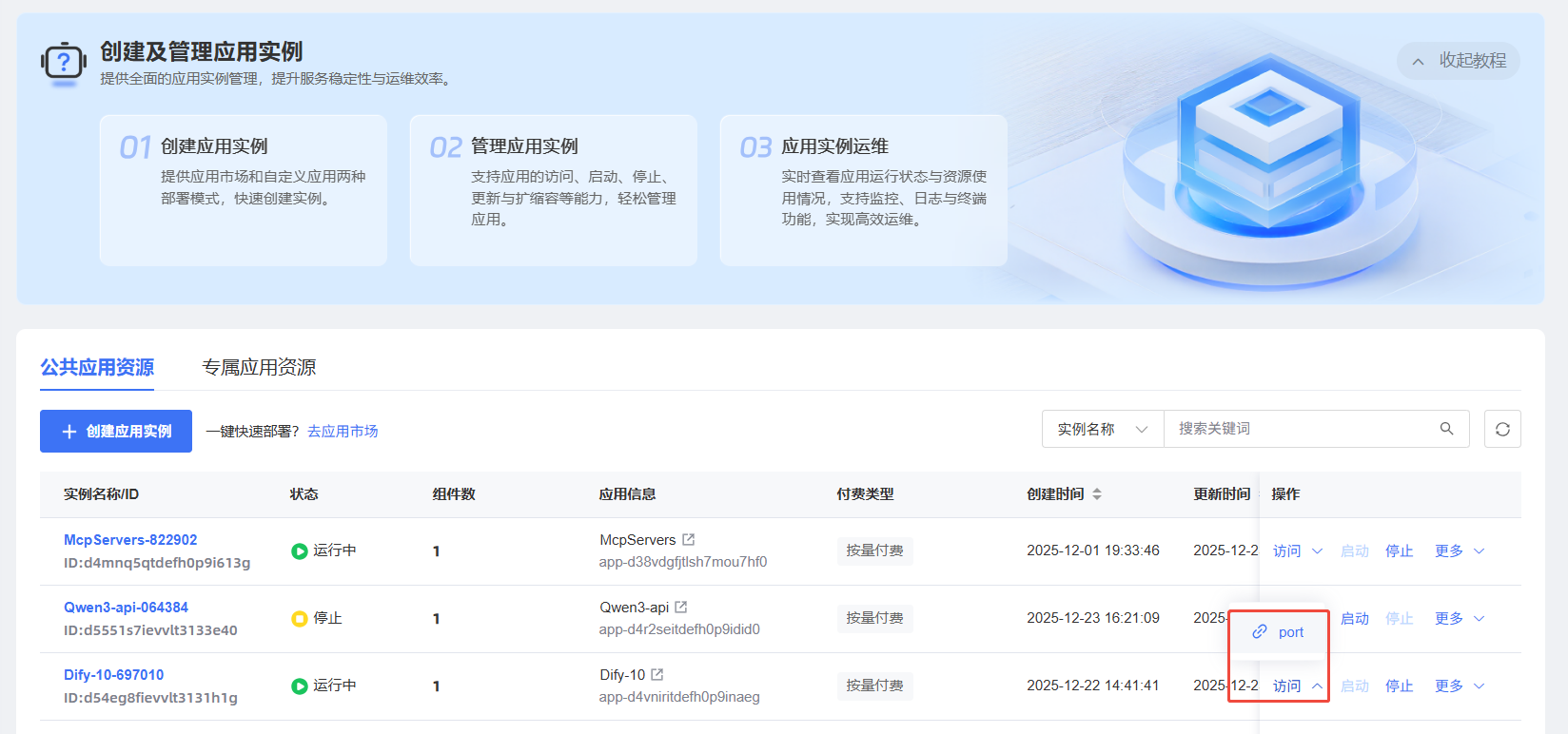 进入应用托管租户控制台。选择【应用实例】,进入应用实例列表页面。点击右侧操作栏【访问】,点击下拉访问链接。