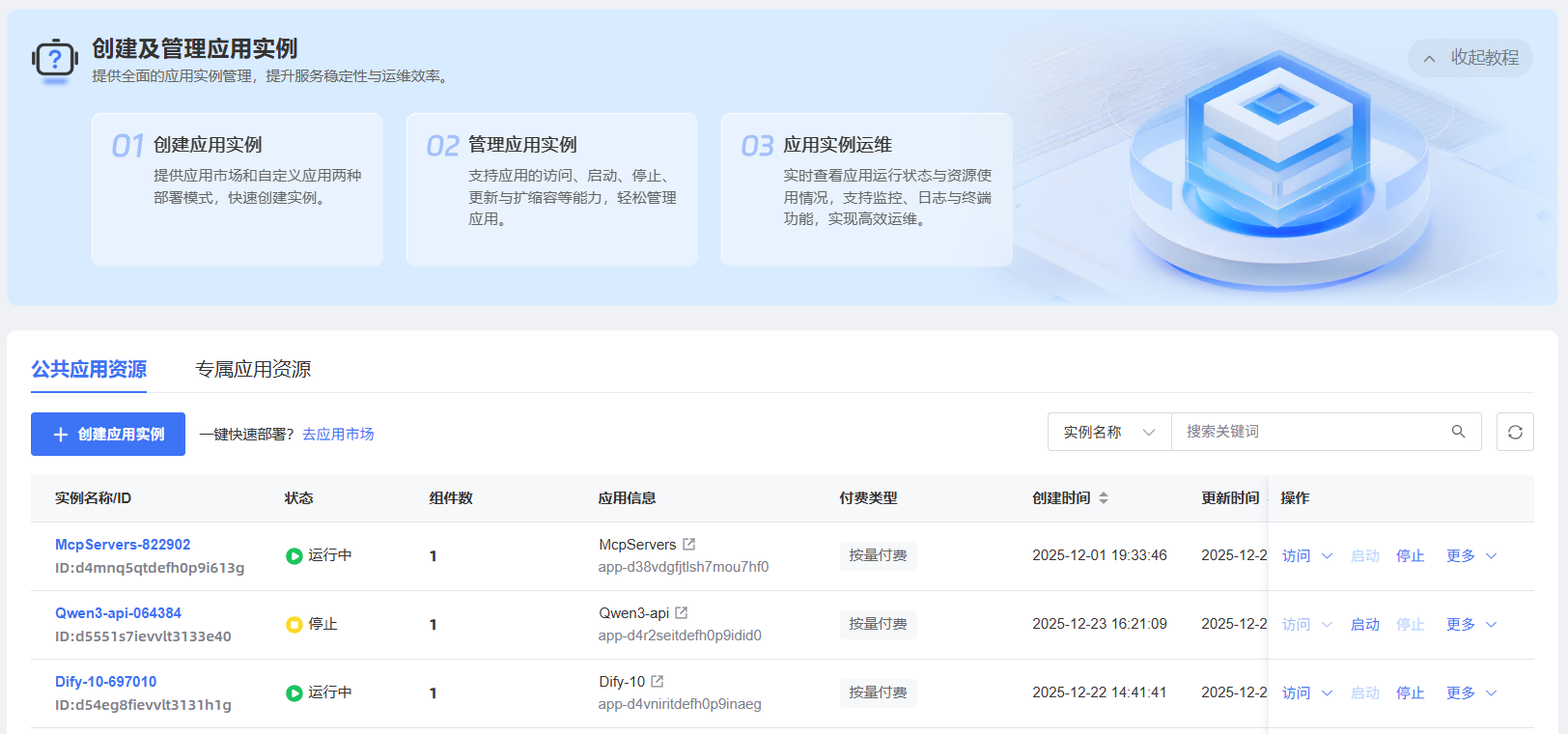 刷新应用实例列表,等待新创建的应用进入到【运行中】状态后,点击右侧操作栏【访问】,点击出现的访问链接,即可进入Dify使用界面。