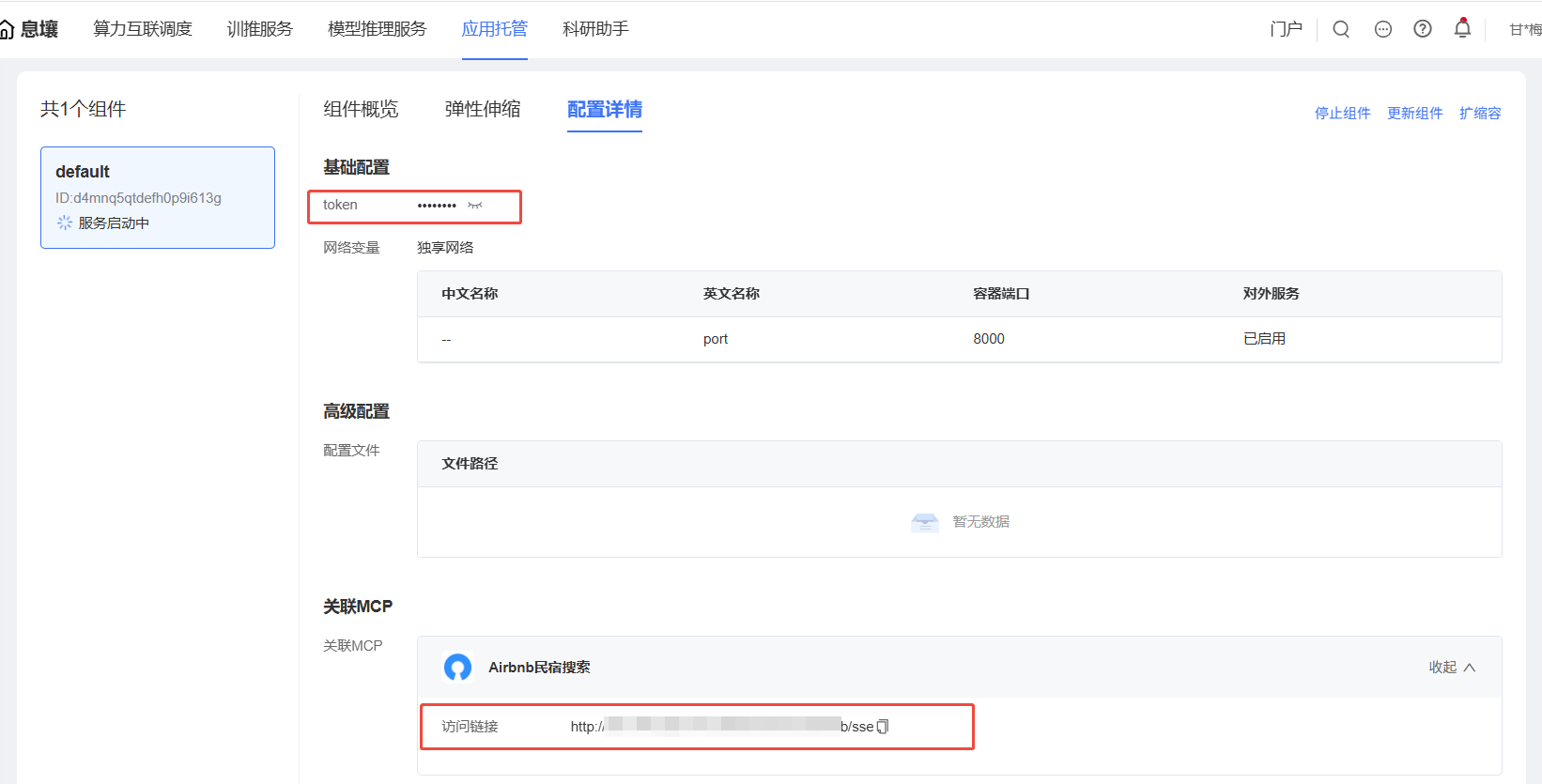点击详情中的【配置详情】TAB,可查询token和mcp服务的URL。