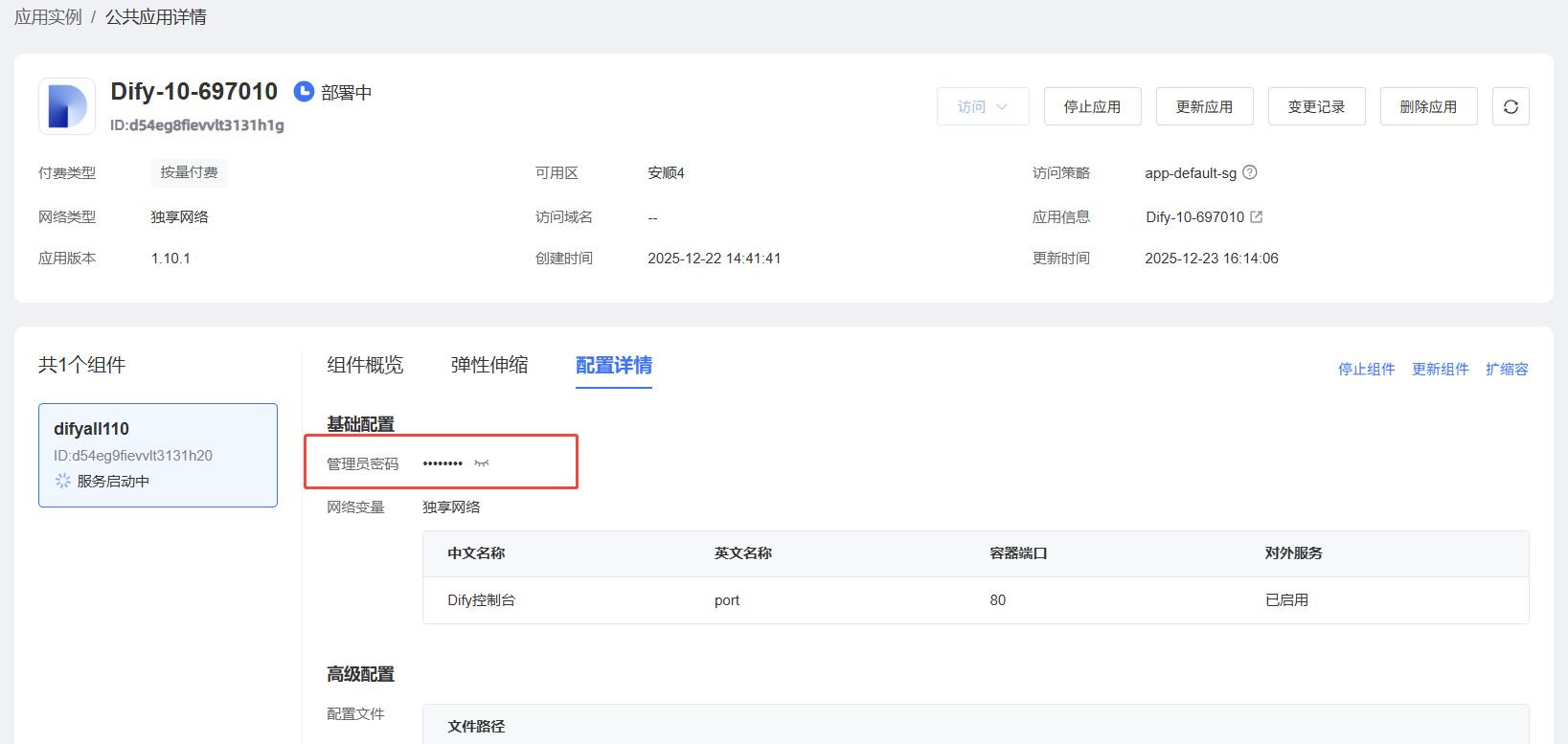 填写管理密码,选择访问策略及公网访问,勾选同意用户协议,点击【开启应用】,支付订单,即可完成Dify应用服务部署。