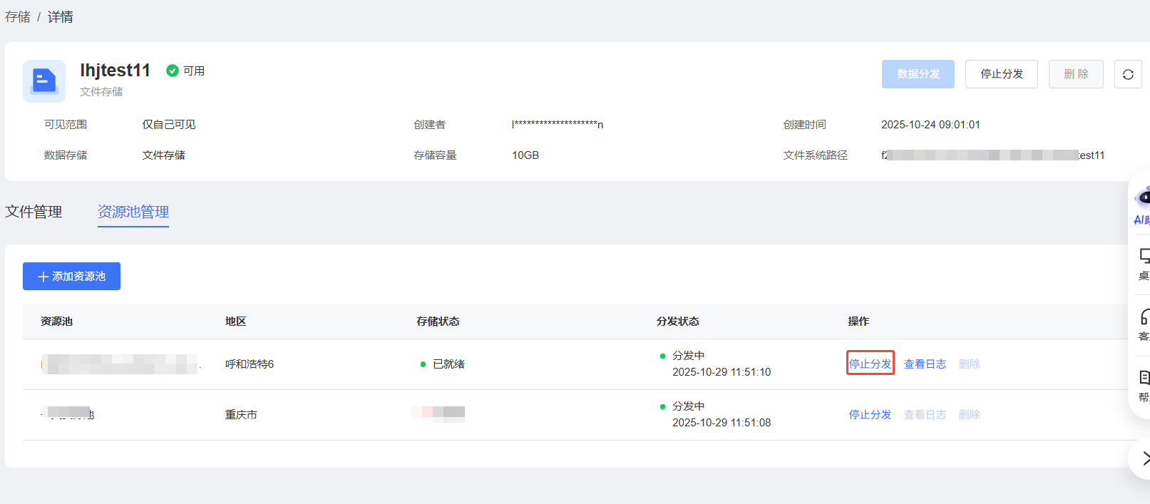 单击资源池列表的【停止分发】按钮,可终止该资源池的数据分发。
