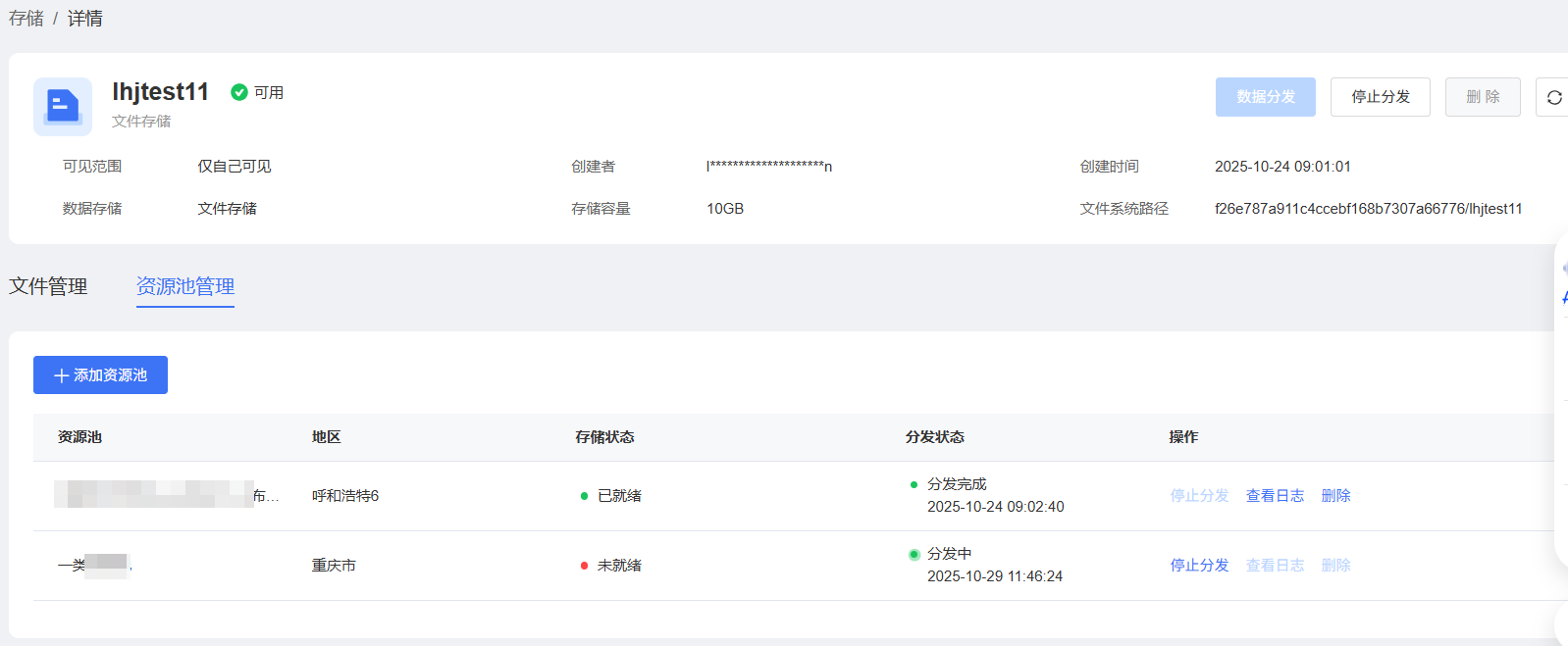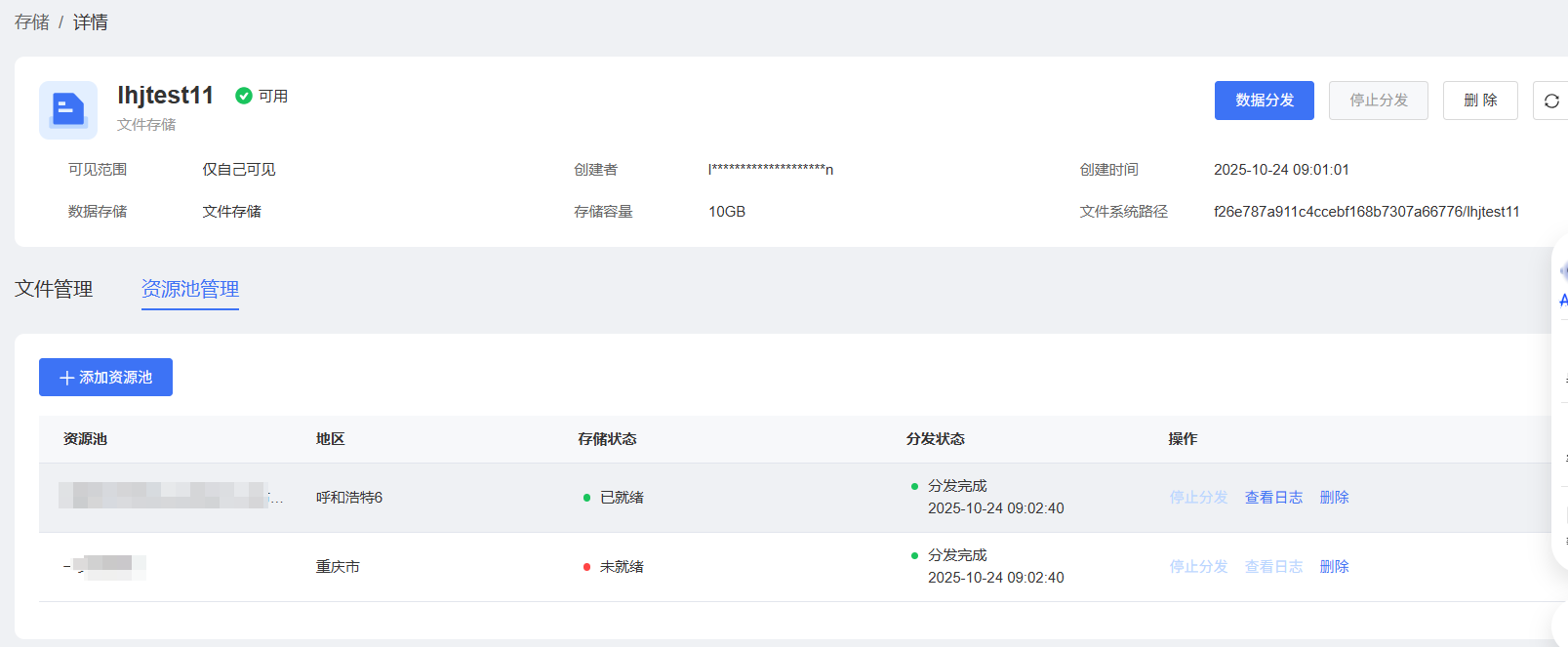 在存储详情的资源池管理页面。可查询到已添加的资源池,当存储状态显示为‘已就绪’时,该资源池存储可用。