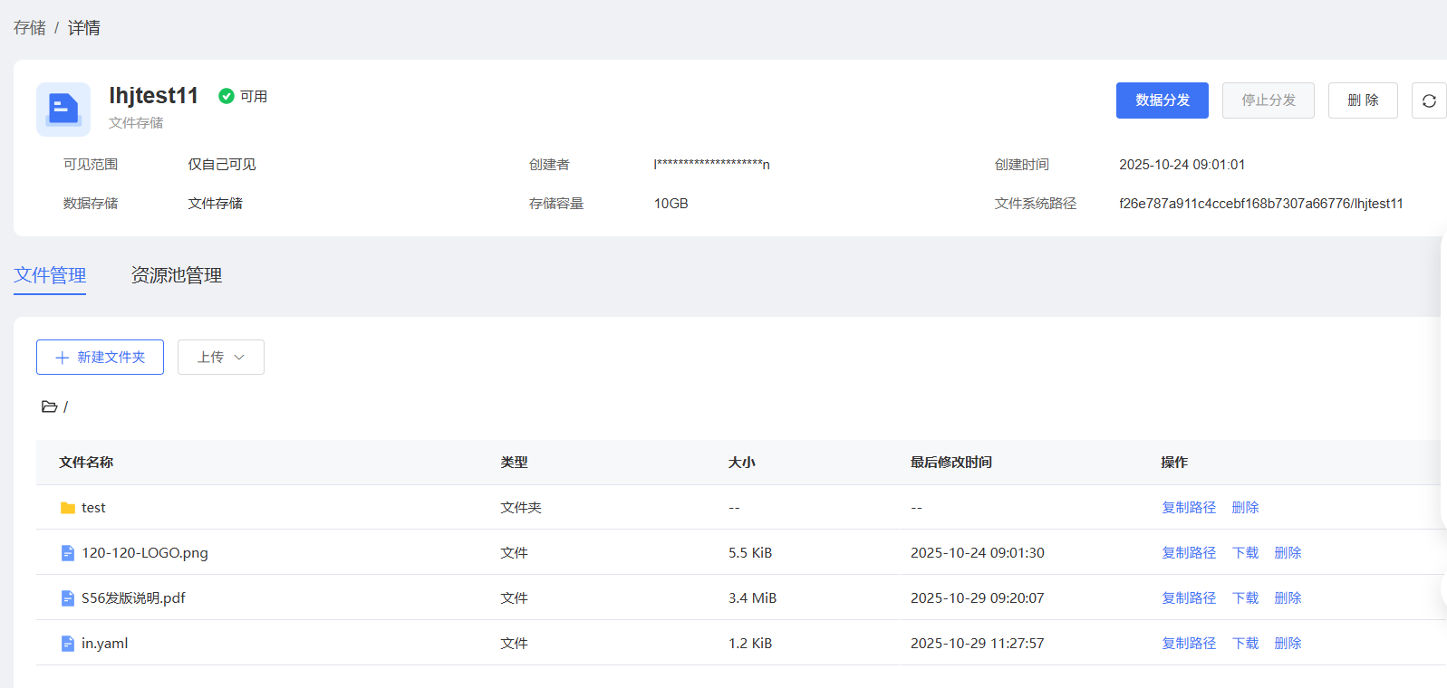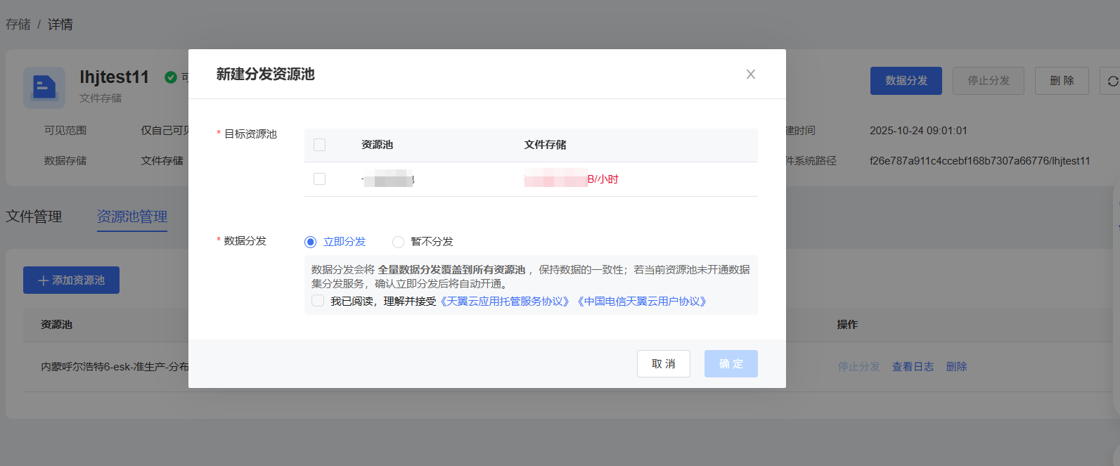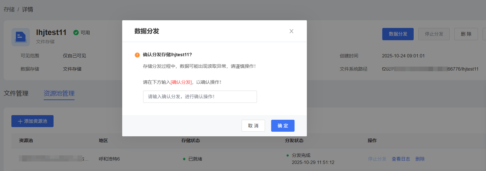 在存储详情页,单击右上角的【数据分发】按钮,在“数据分发”弹窗中二次确认后,可触发数据分发到已添加的资源池。