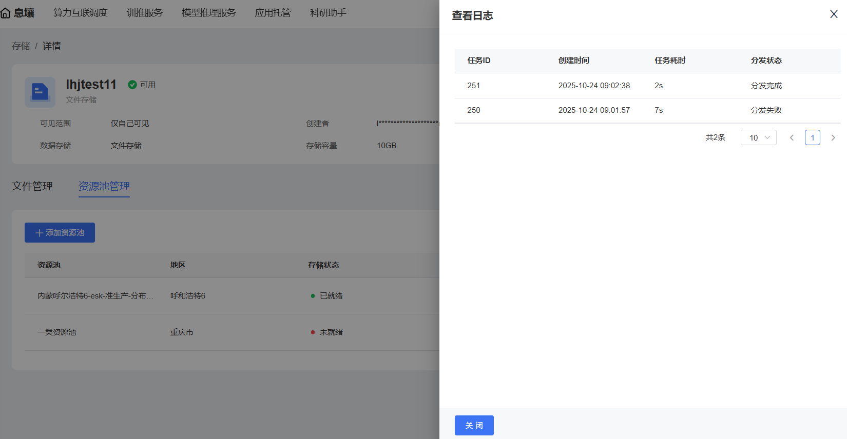 单击资源池列表的【查看日志】按钮,可查询数据分发日志。