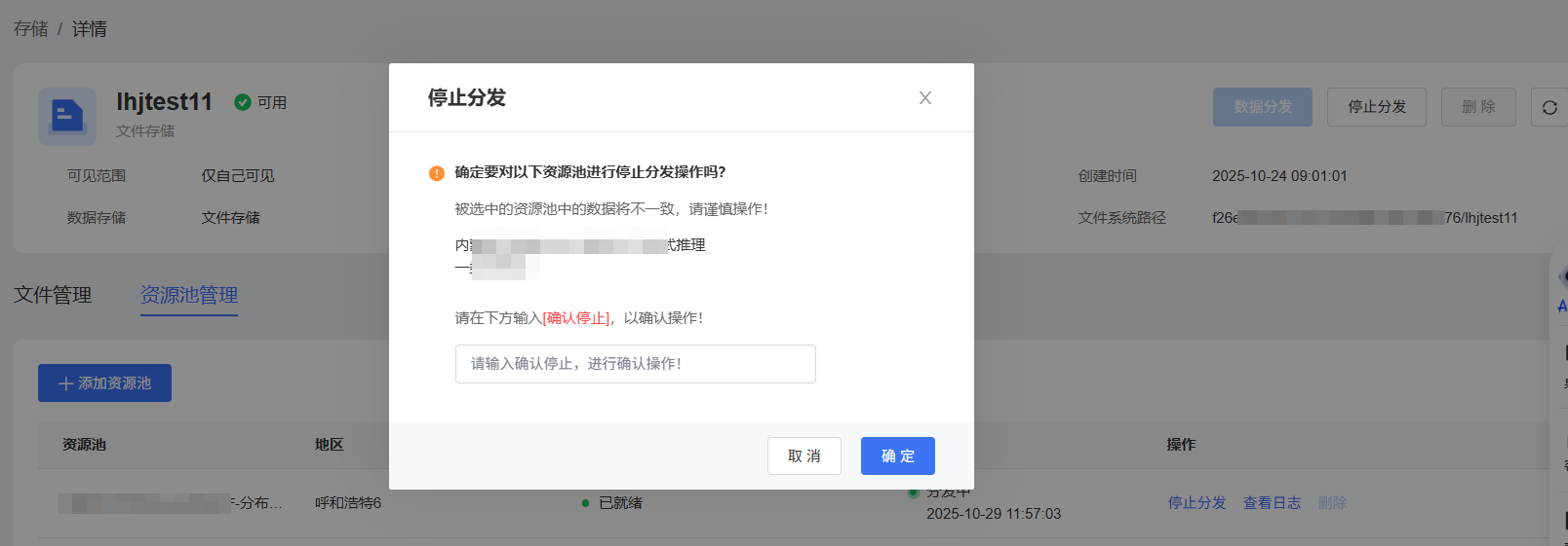 单击【停止分发】按钮,在“停止分发”弹窗中二次确认后,停止对选中资源池的数据分发。