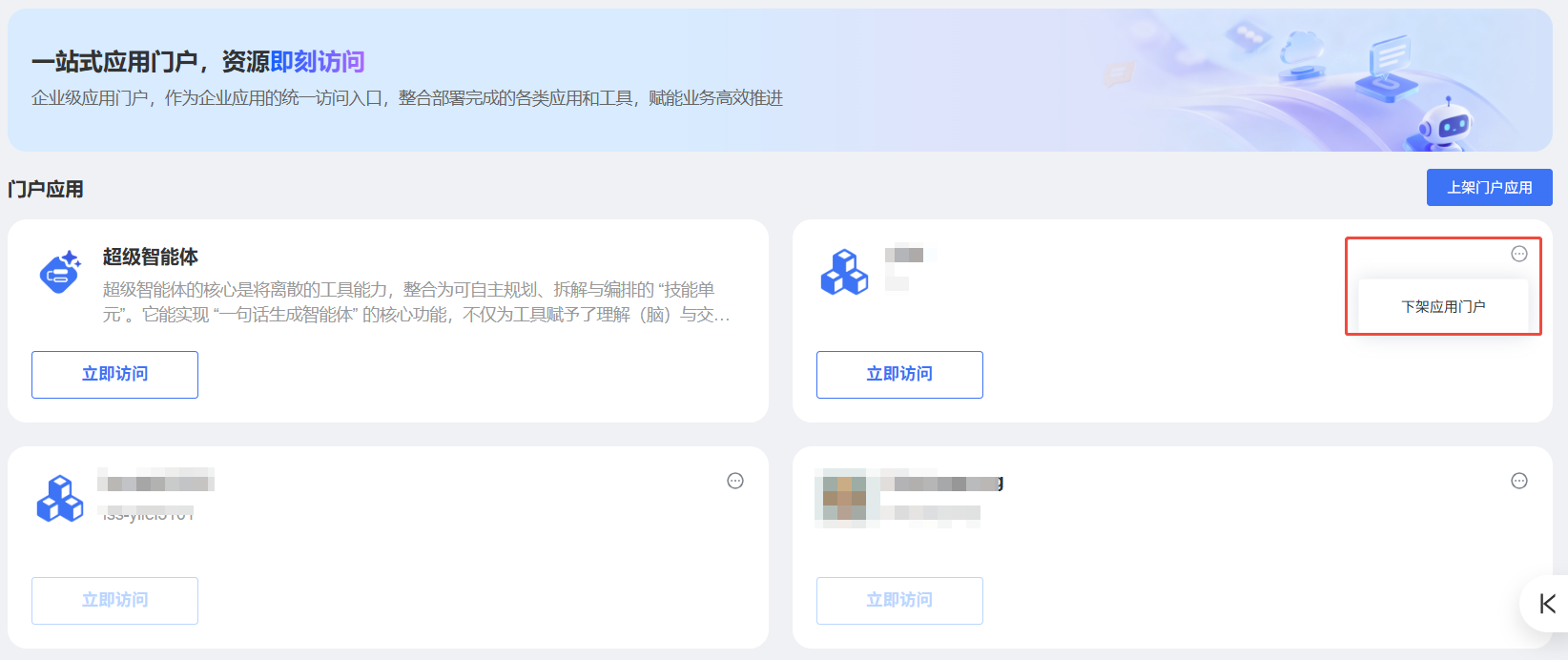 登录应用托管控制台,在左侧导航栏单击【应用】->【应用门户】,单击目标应用的【下架门户应用】按钮。