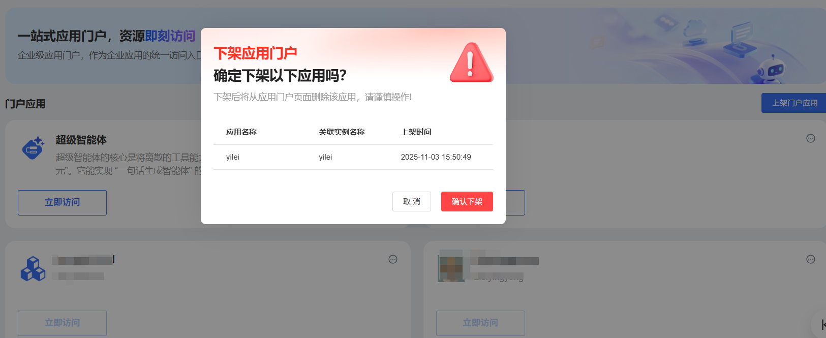 在“下架门户应用”弹窗中,单击【确认下架】按钮,完成应用下架。
