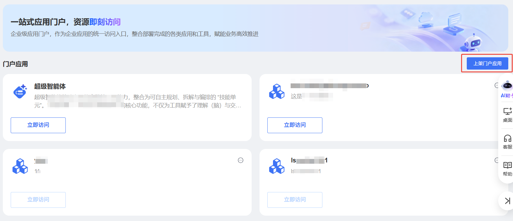 登录应用托管控制台,在左侧导航栏单击【应用】->【应用门户】,单击【上架门户应用】按钮。