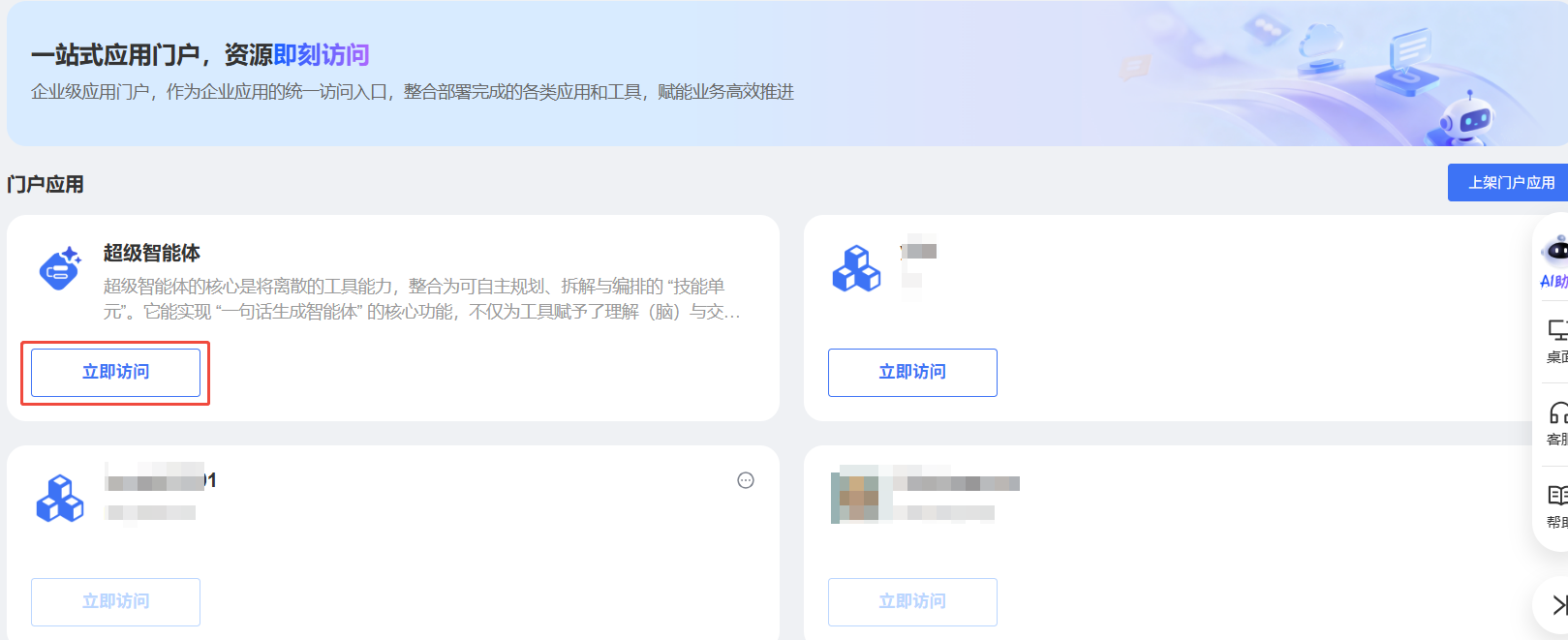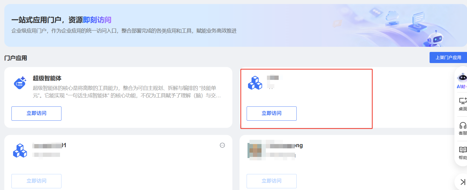 登录应用托管控制台,在左侧导航栏单击【应用】->【应用门户】,单击目标应用的【立即访问】按钮,即可访问应用。