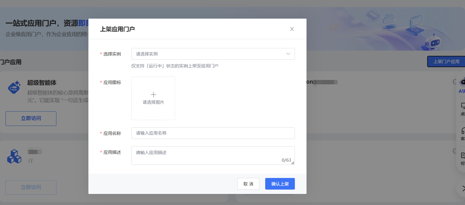 在“上架门户应用”弹窗表单中,填写上架应用信息:应用实例、应用图标、应用名称和应用描述。