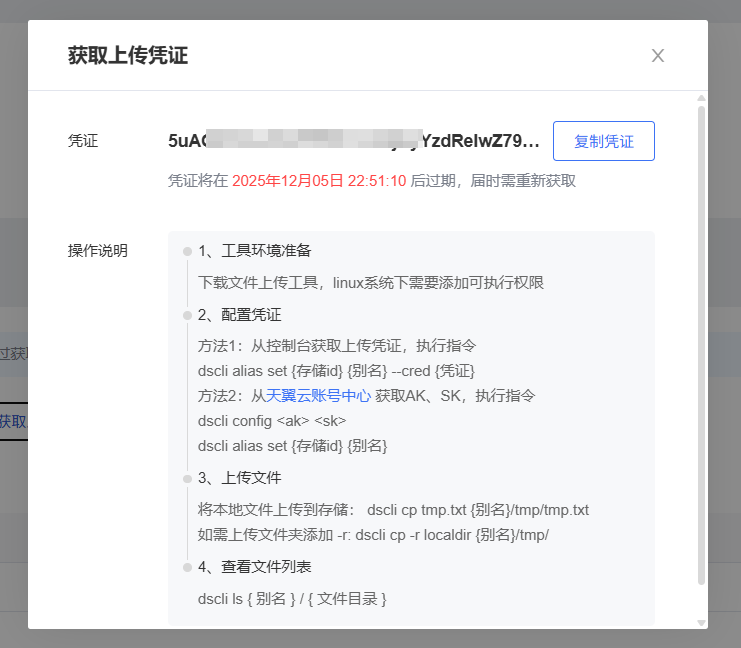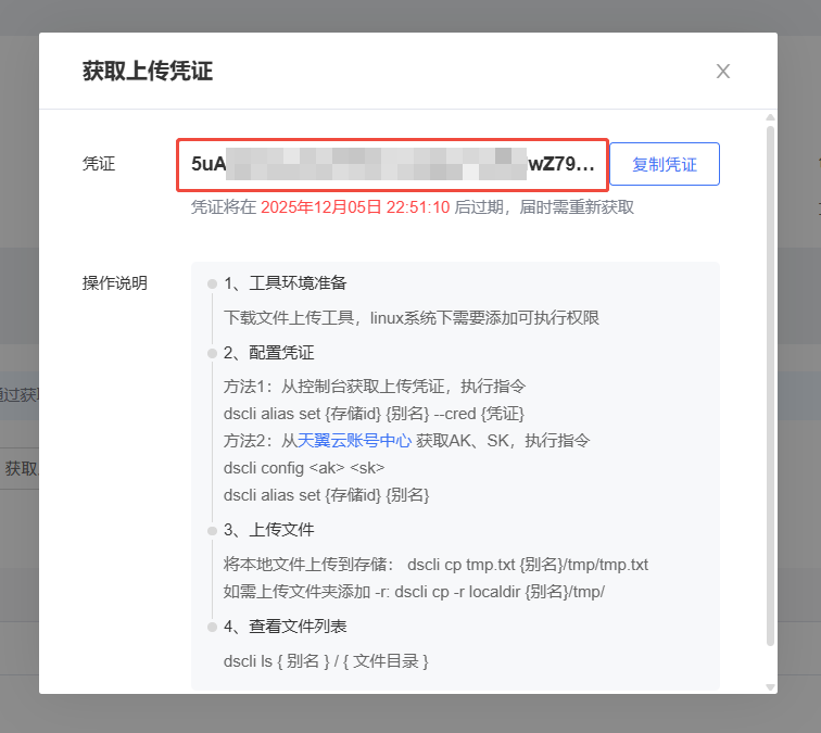 chmod +x dscli从控制台获取上传凭证,执行以下指令,完成凭证配置。
