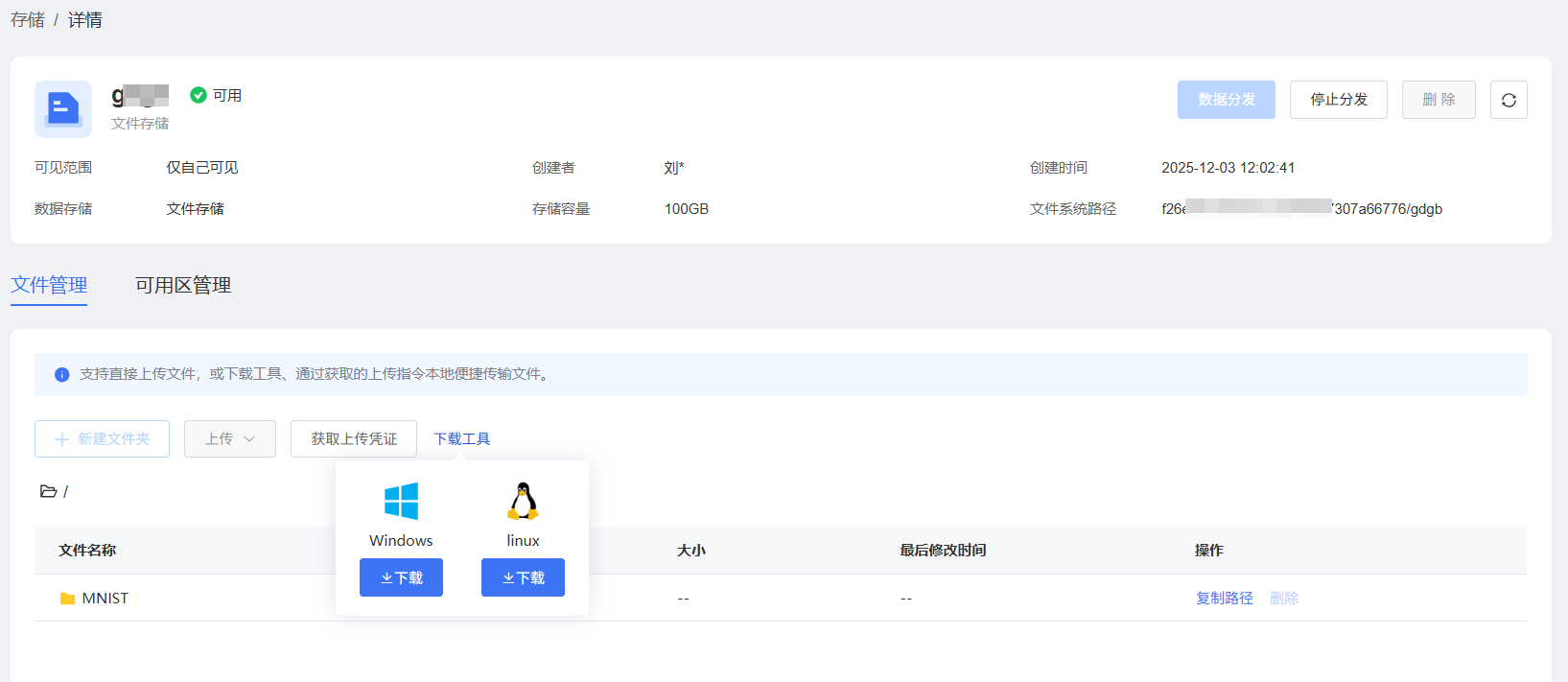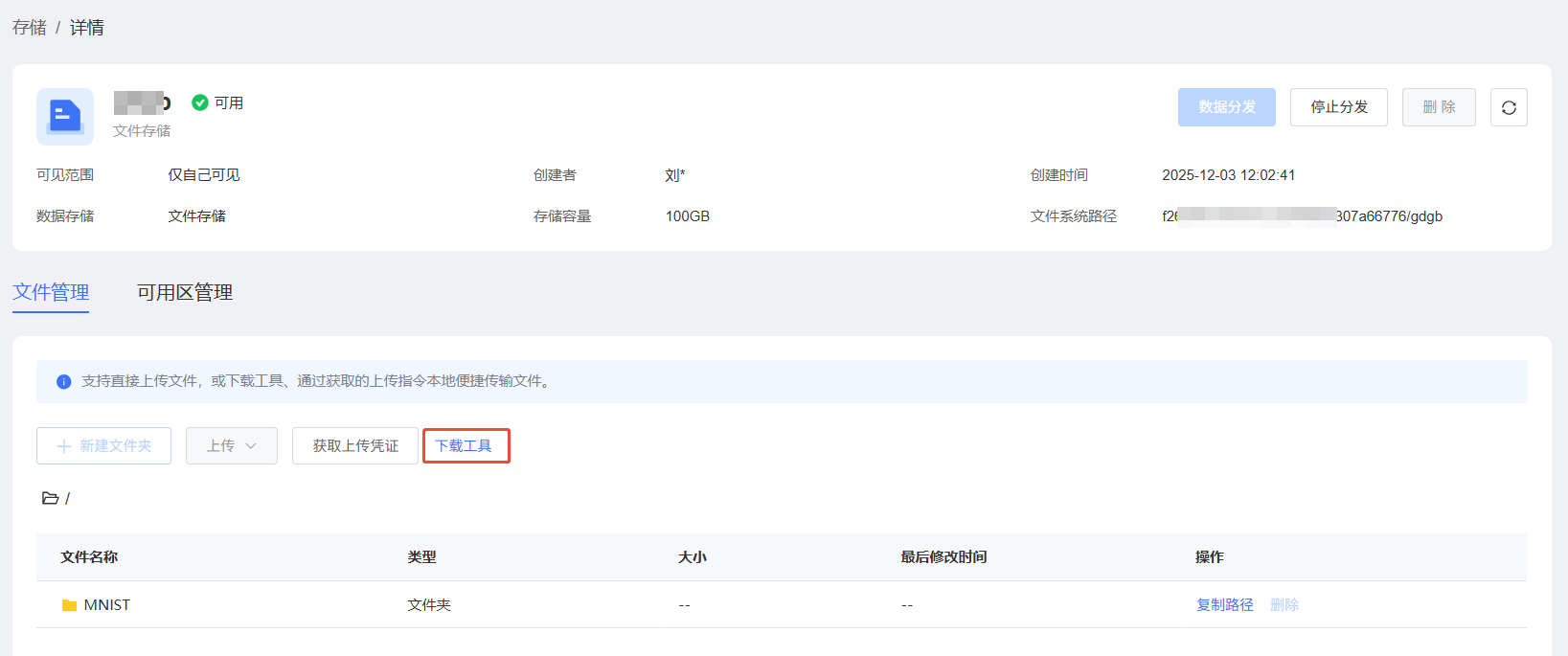 登录应用托管控制台,在左侧导航栏单击【资产】->【存储】,单击存储实例名称进入详情。在详情页单击【下载工具】按钮。