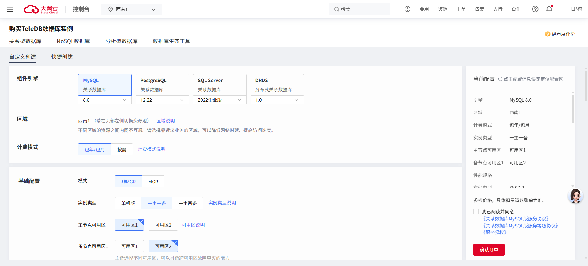在开通终端节点的VPC下创建数据库服务,这里以创建关系型数据库(MySQL)为例。