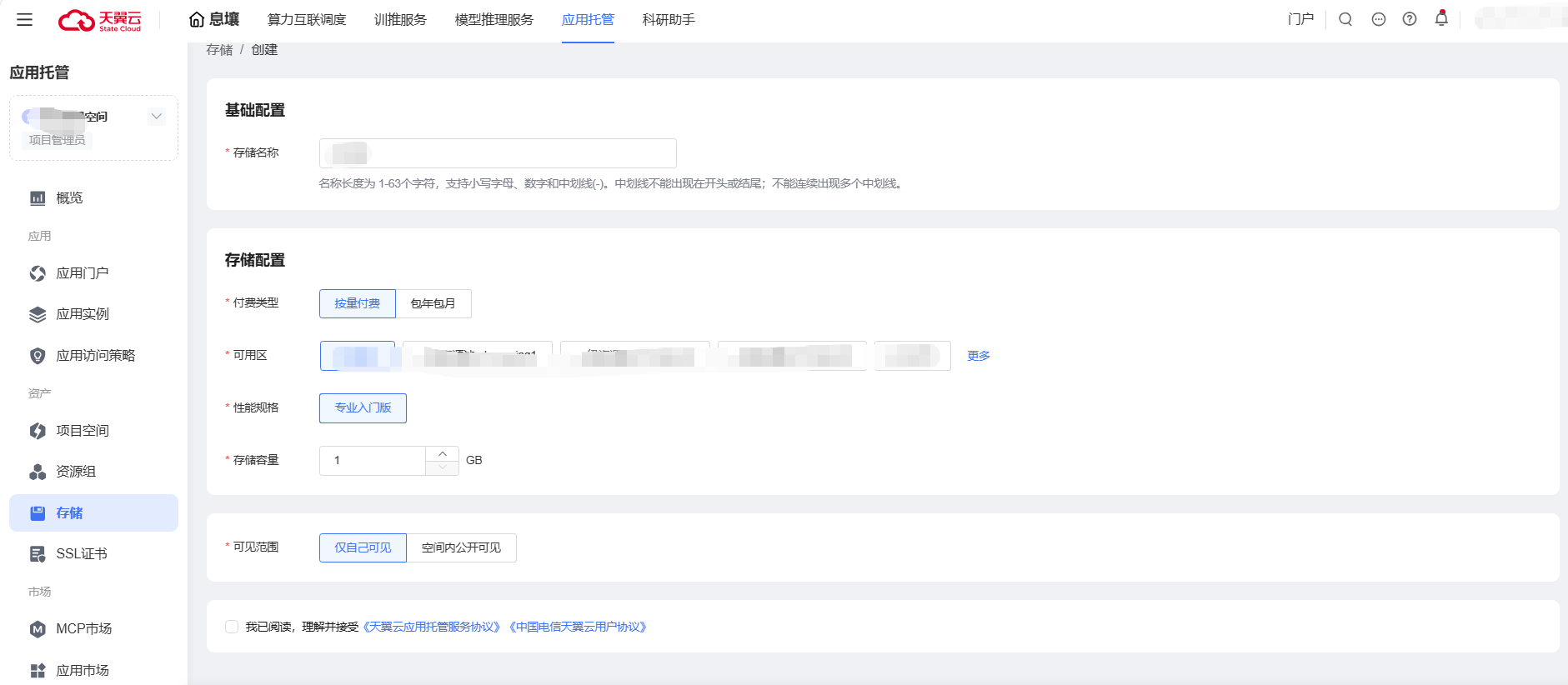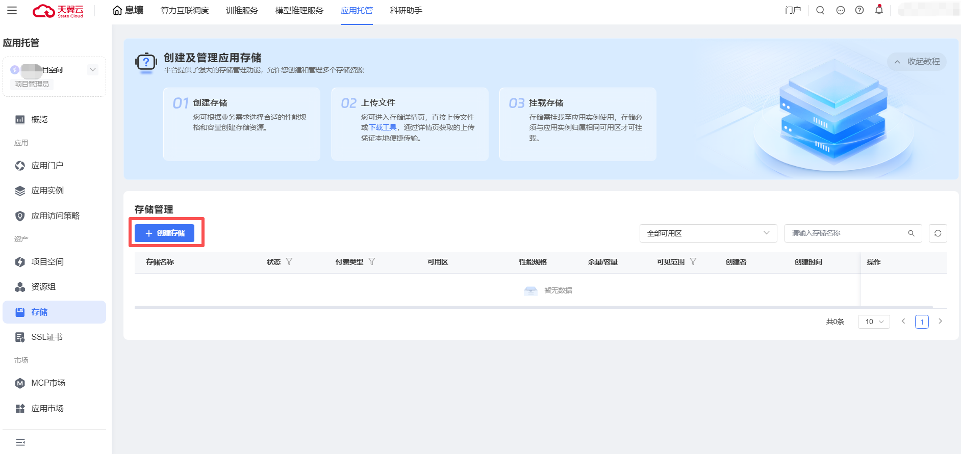 登录应用托管控制台,在左侧导航栏单击【资产】->【存储】,单击【创建存储】按钮。