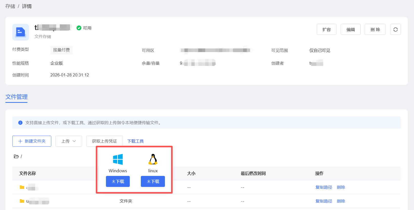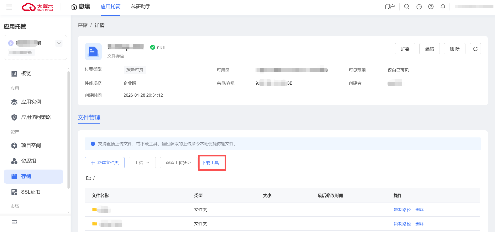 登录应用托管控制台,在左侧导航栏单击【资产】->【存储】,单击存储实例名称进入详情。在详情页单击【下载工具】按钮。