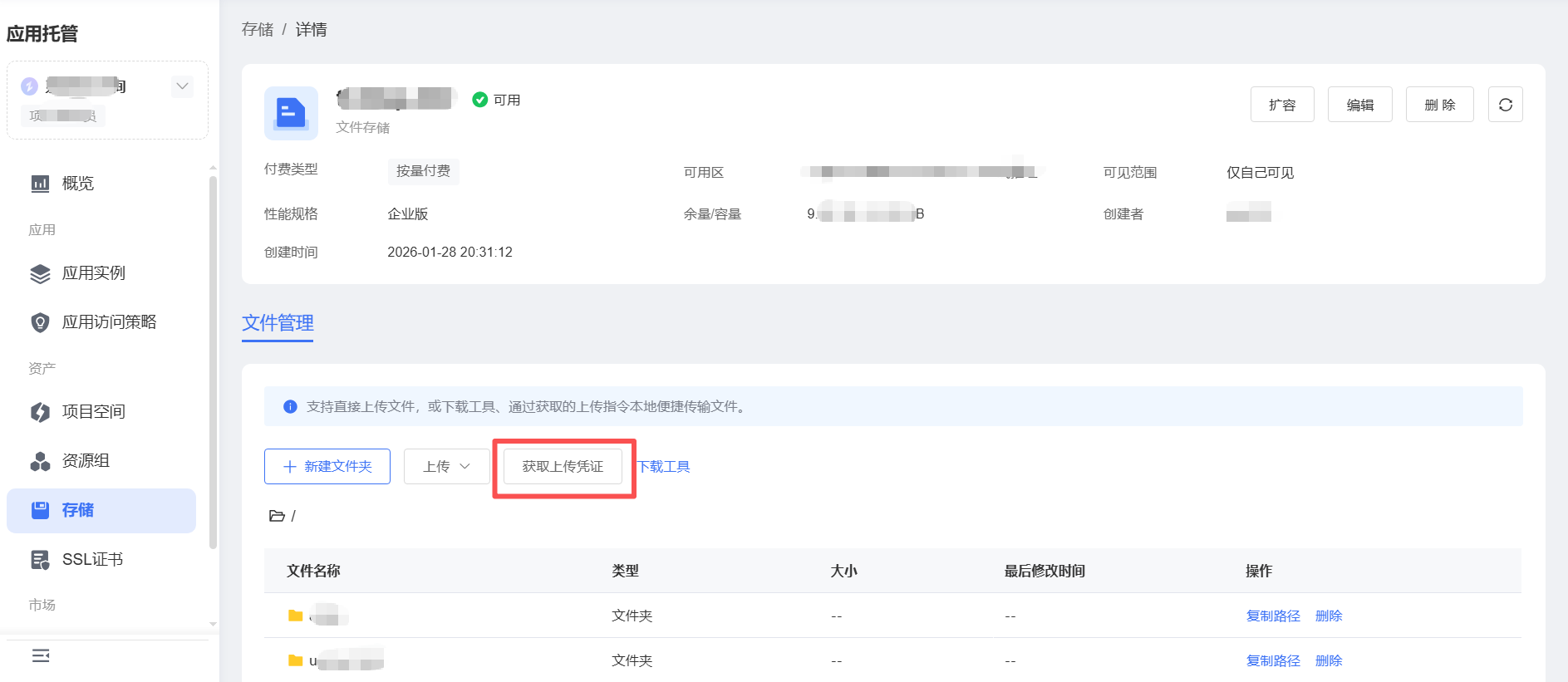 登录应用托管控制台,在左侧导航栏单击【资产】->【存储】,单击存储实例名称进入详情。在详情页单击【获取上传凭证】按钮。