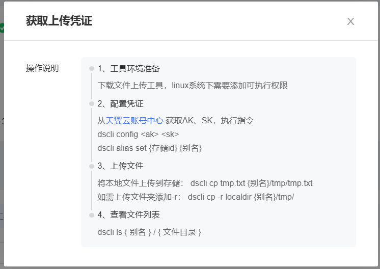chmod +x dscli从控制台获取上传凭证,执行以下指令,完成凭证配置。