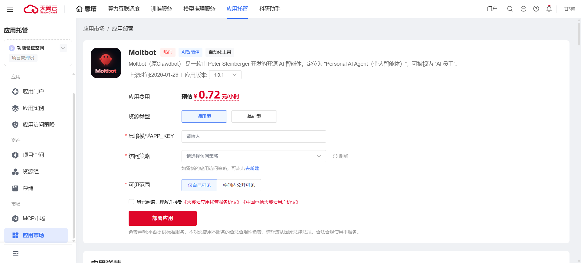 3. 填写天翼云息壤模型推理服务的APP KEY,选择访问策略,勾选同意用户协议,点击【部署应用】,即可完成Moltbot应用服务部署。