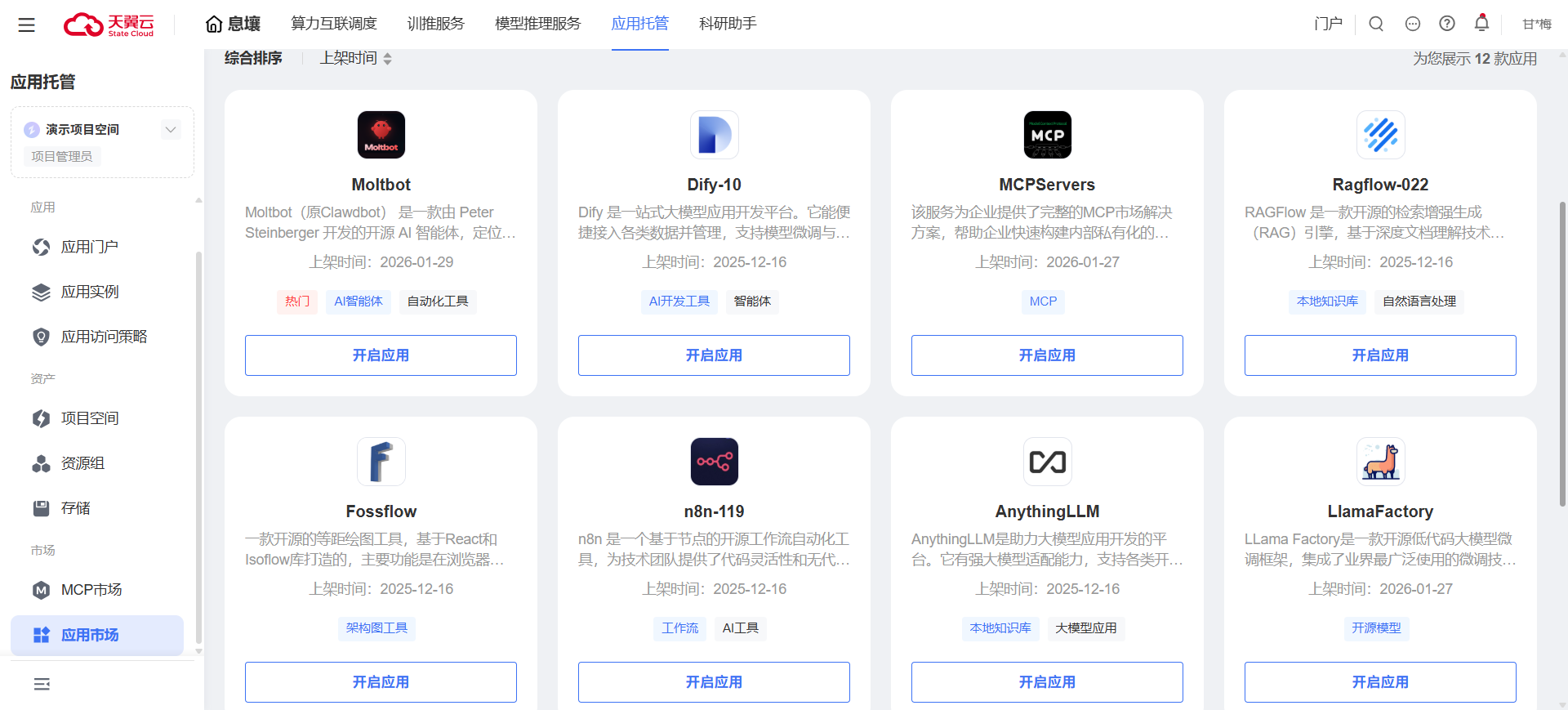 1. 登录应用托管控制台,选择左侧【应用市场】,点击进入对应页面。