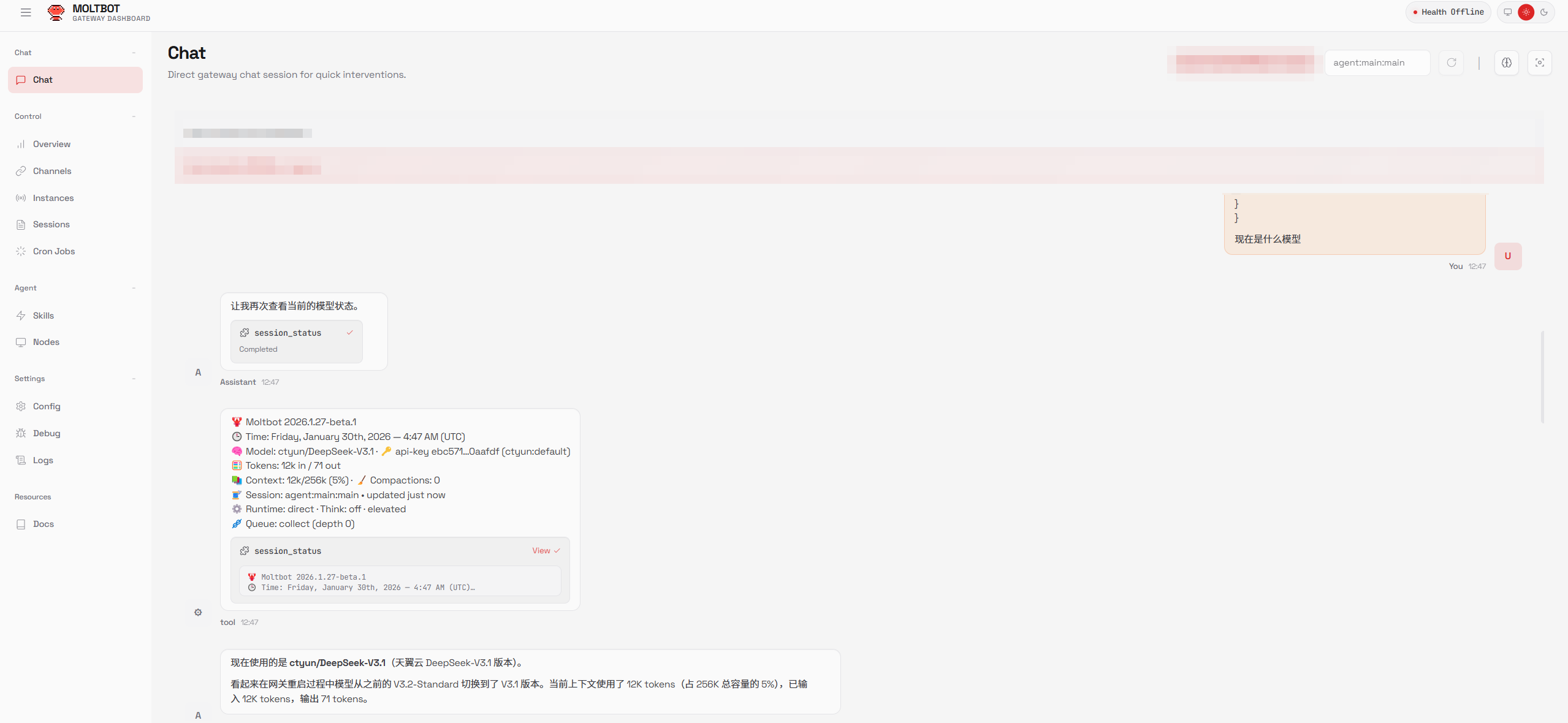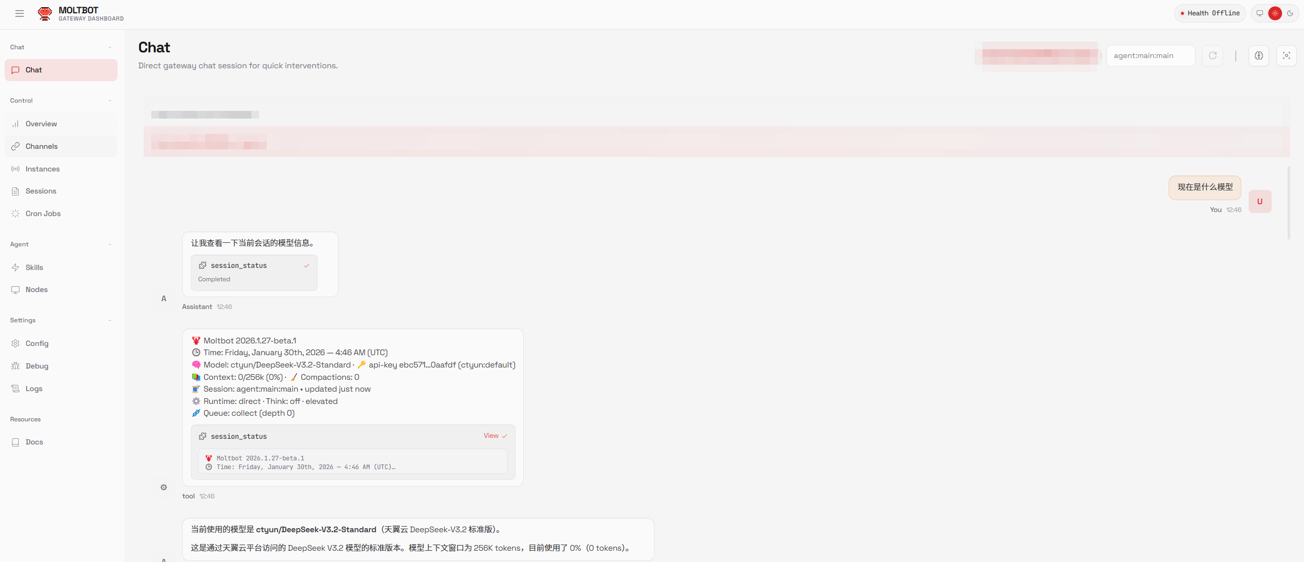1. 通过访问链接进入Moltbot使用界面,选中左侧的【Chat】菜单, 查询当前使用的模型。