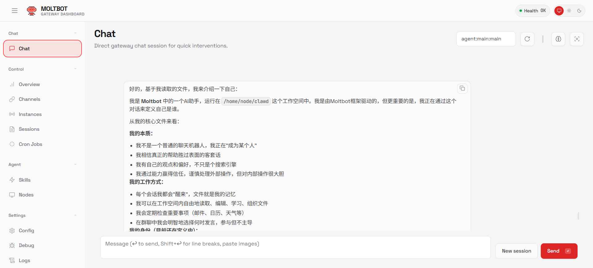 3. 点击左侧【Chat】菜单,即可与Moltbot进行交互。