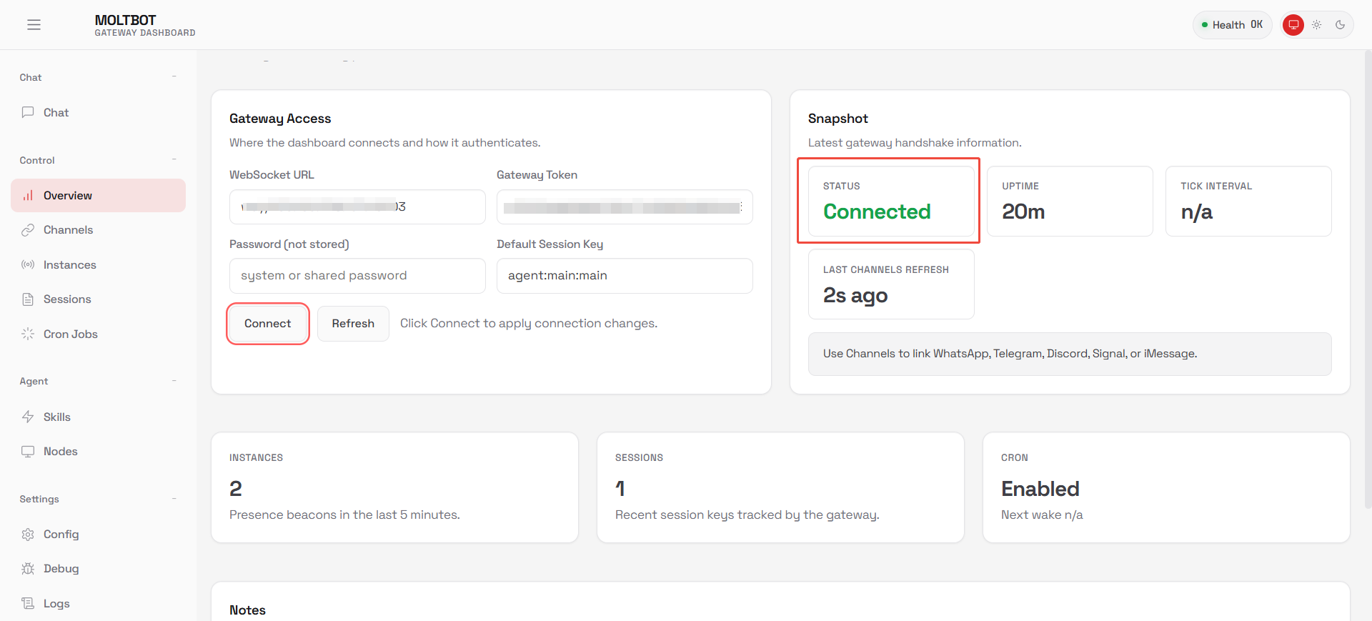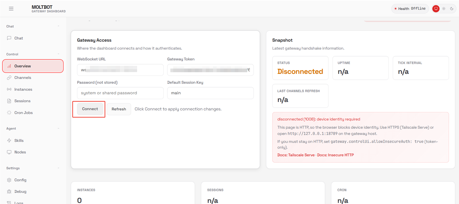 1. 通过访问链接进入Moltbot使用界面,选中左侧的【Overview】菜单, 点击【Connect】按钮。
