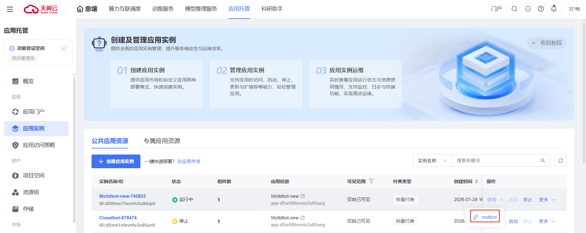 4.提交表单后进入应用实例列表页面,点击操作栏【访问】按钮,点击下拉访问链接,进入Moltbot使用界面。