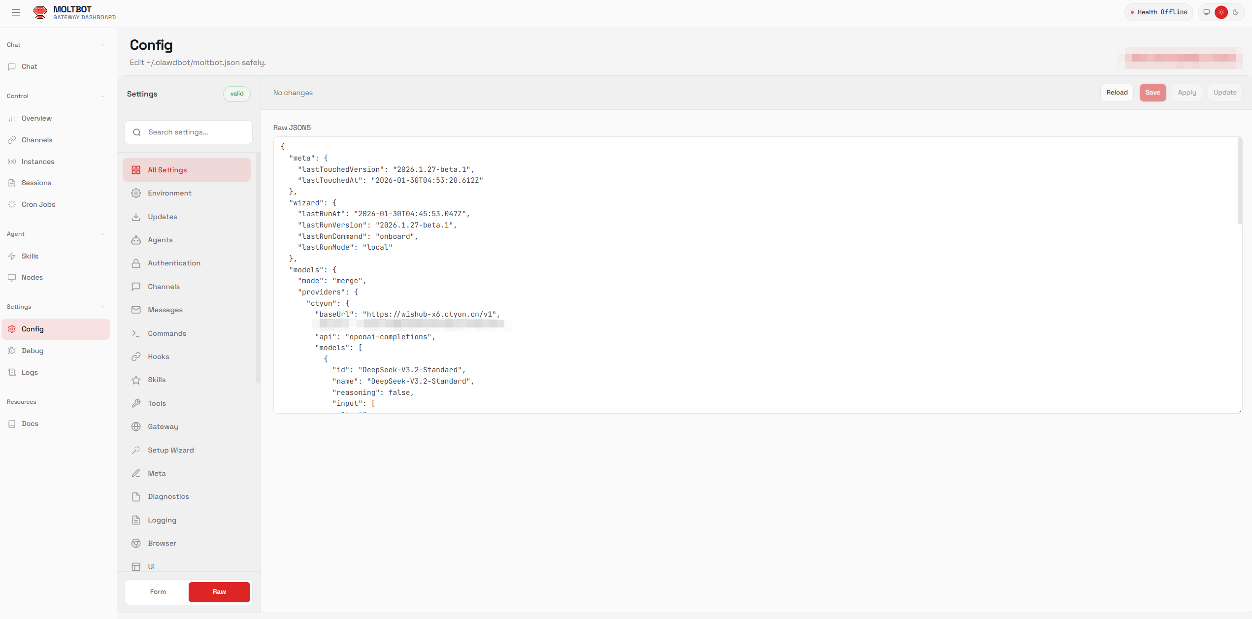 2. 选中左侧的【Config】菜单, 点击Settings最下方的Raw,以文本格式查看配置信息。