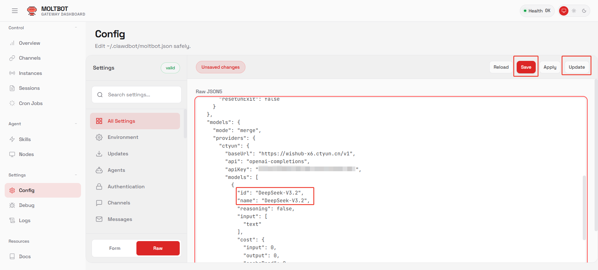 3. 查找配置文本中的所有DeepSeek-V3.2-Standard替换成天翼云息壤推理服务其他模型(如:DeepSeek-V3.1),修改完成后,点击右上角【Save】,然后再点击【Update】更新网关配置。