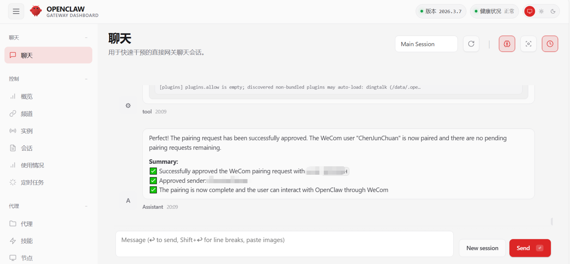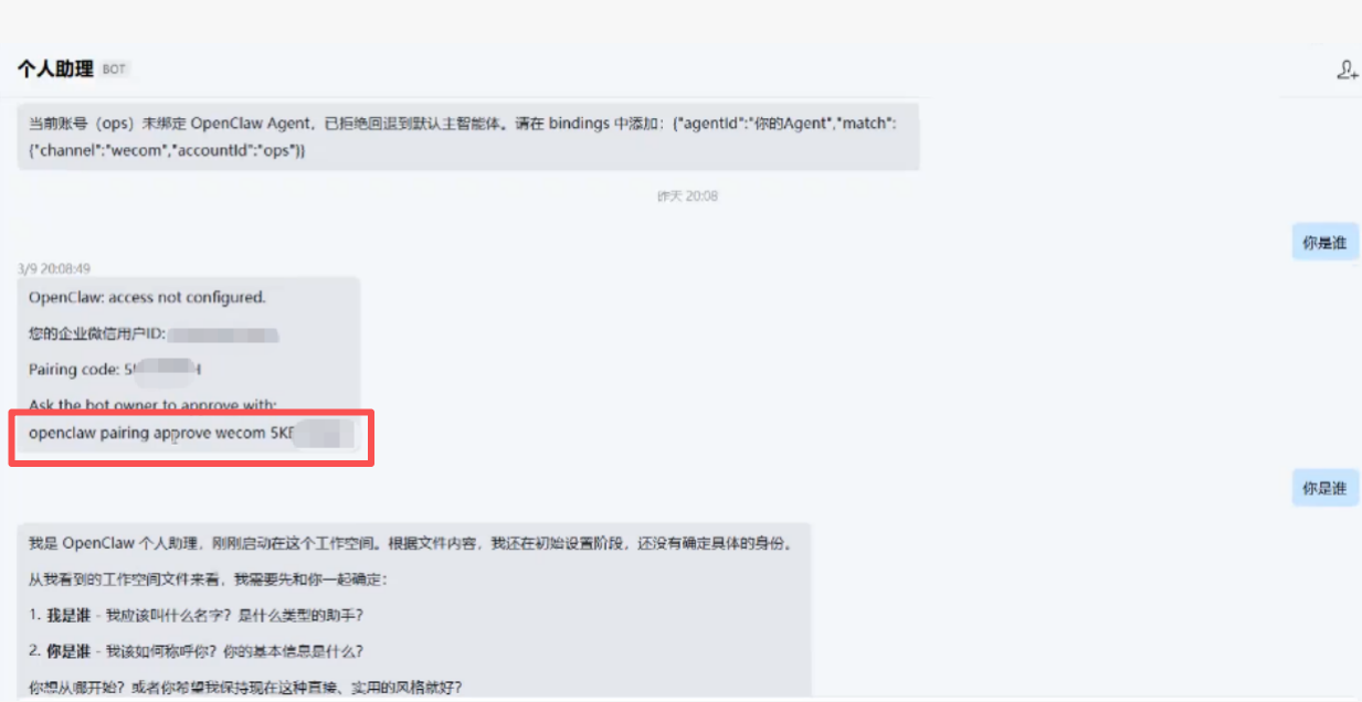 在企业微信机器人对话框中,将配对码复制(如下图红框),发送给openclaw对进行配对过程。