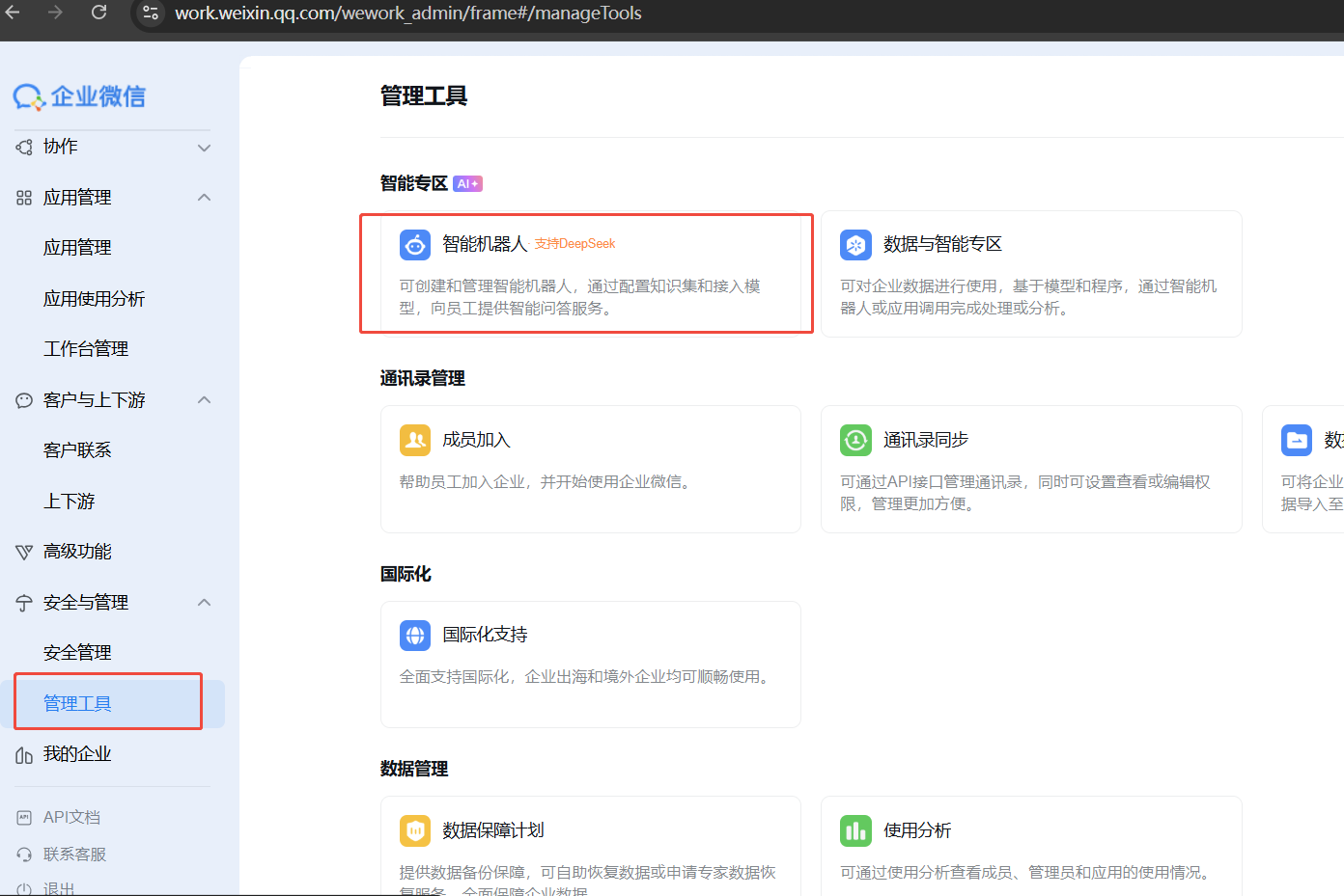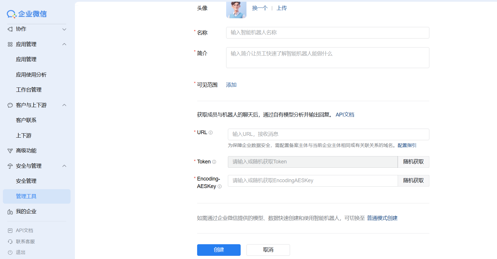 1.用企业管理员账号登录企业微信平台,点击安全与管理->管理工具菜单,点击智能机器人,开始创建智能机器人。