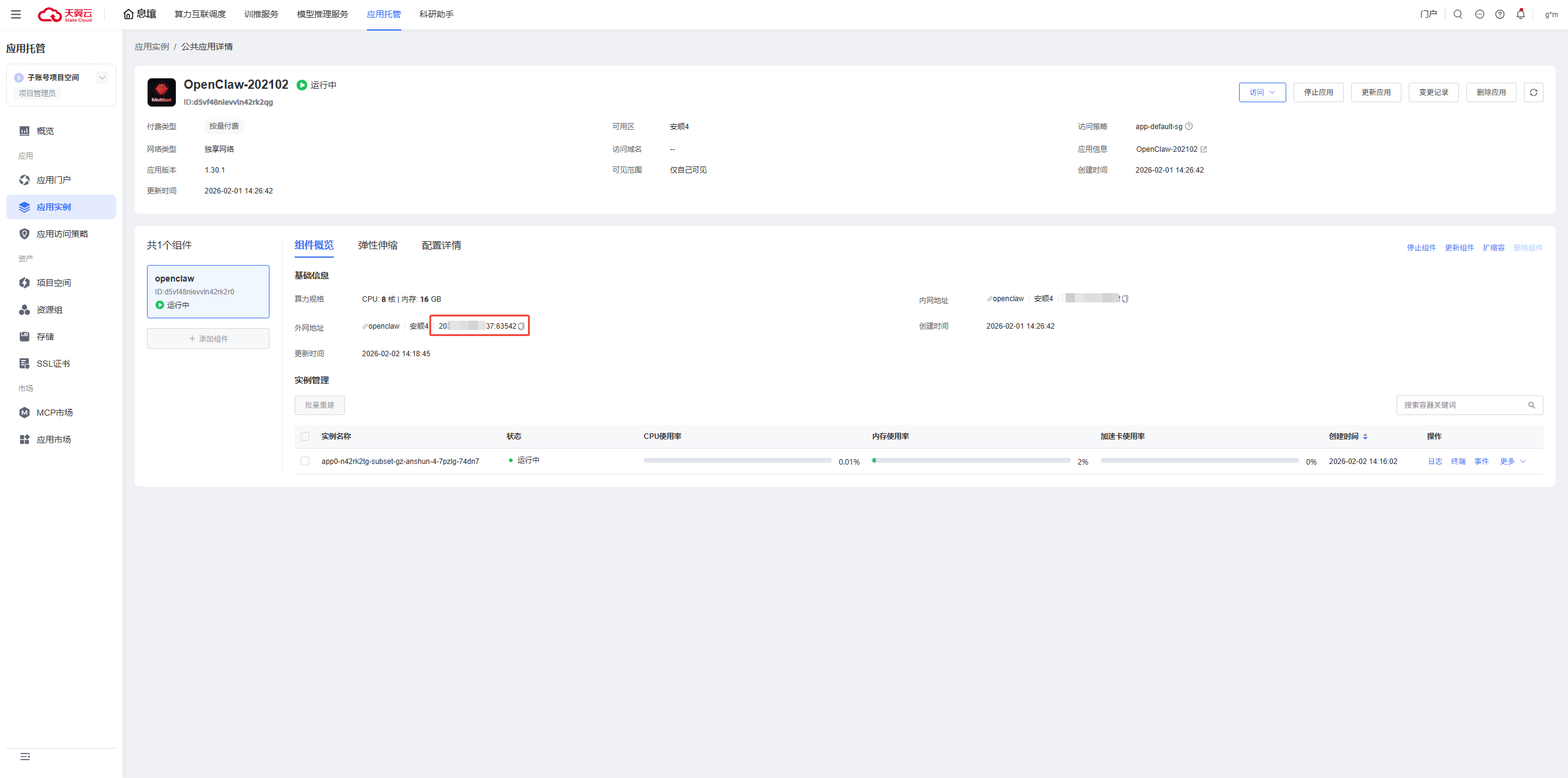 OpenClaw的网关地址在应用托管控制台-【应用实例】-【应用详情】-【组件概览】的外网地址中获取。