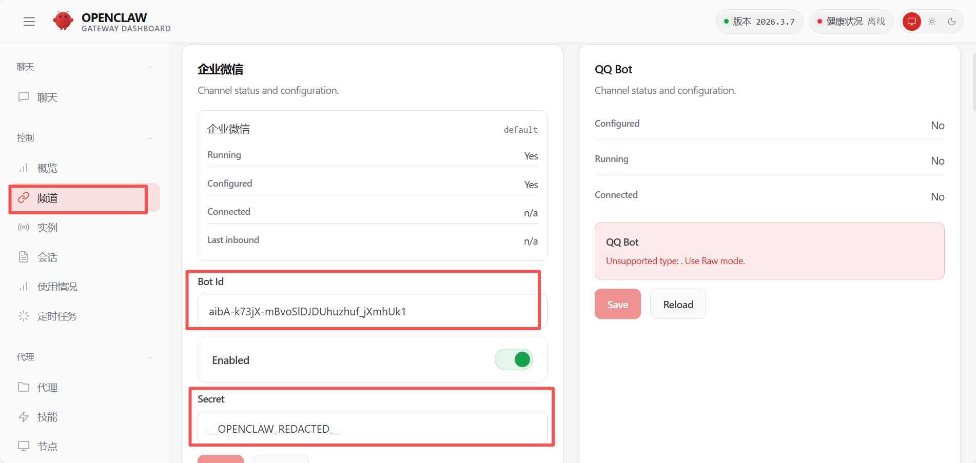 1. 通过访问地址打开OpenClaw,点击左侧菜单【Channels】进入channel配置页面,配置Bot Id及Secret。