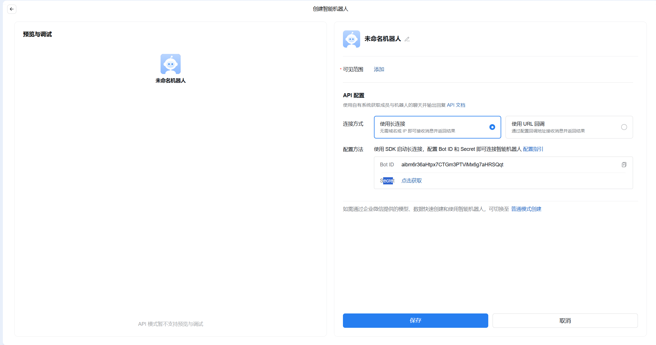 3. 进入API模式创建后,在API配置中,连接方式选择【使用长连接】,配置方法中字段Bot ID 及Secret,对应OpenClaw中的Bot Id 及Secret(步骤见下),填写完后点击保存。