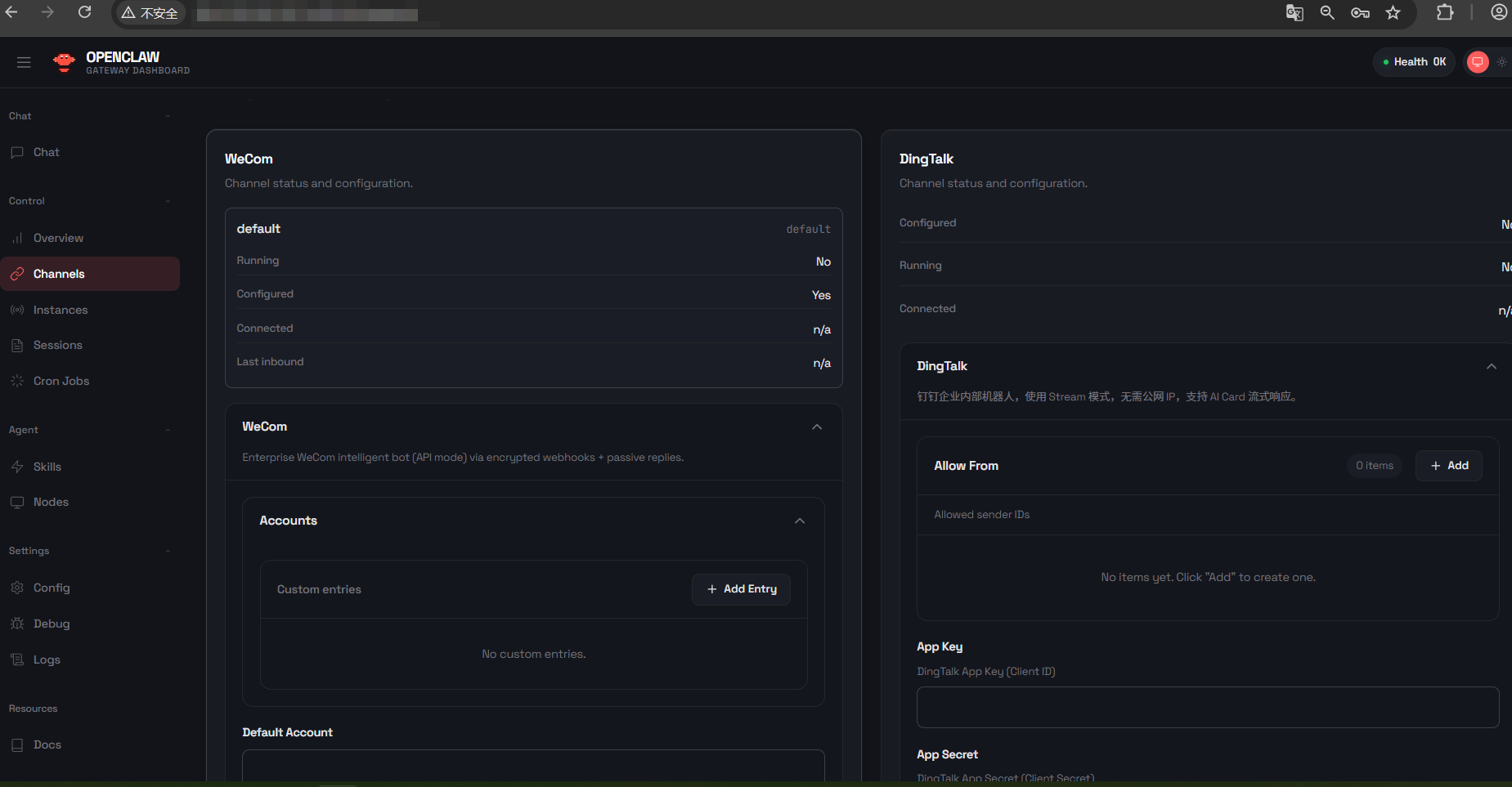 1. 通过访问地址打开OpenClaw,点击左侧菜单【Channels】进入channel配置页面,找到wecom配置。