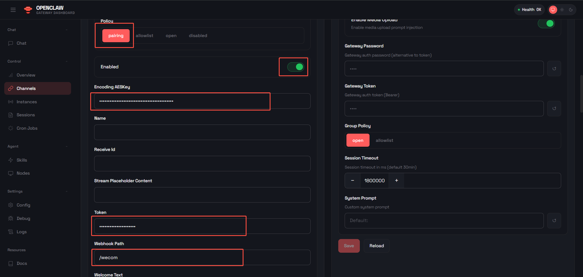2.在 wecom 配置项中,选择policy为“pairing”,开启“Enabled”,并填入前文在企业微信界面生成的Token和EncodingAESKey;Webhook Path填写“/wecom”。