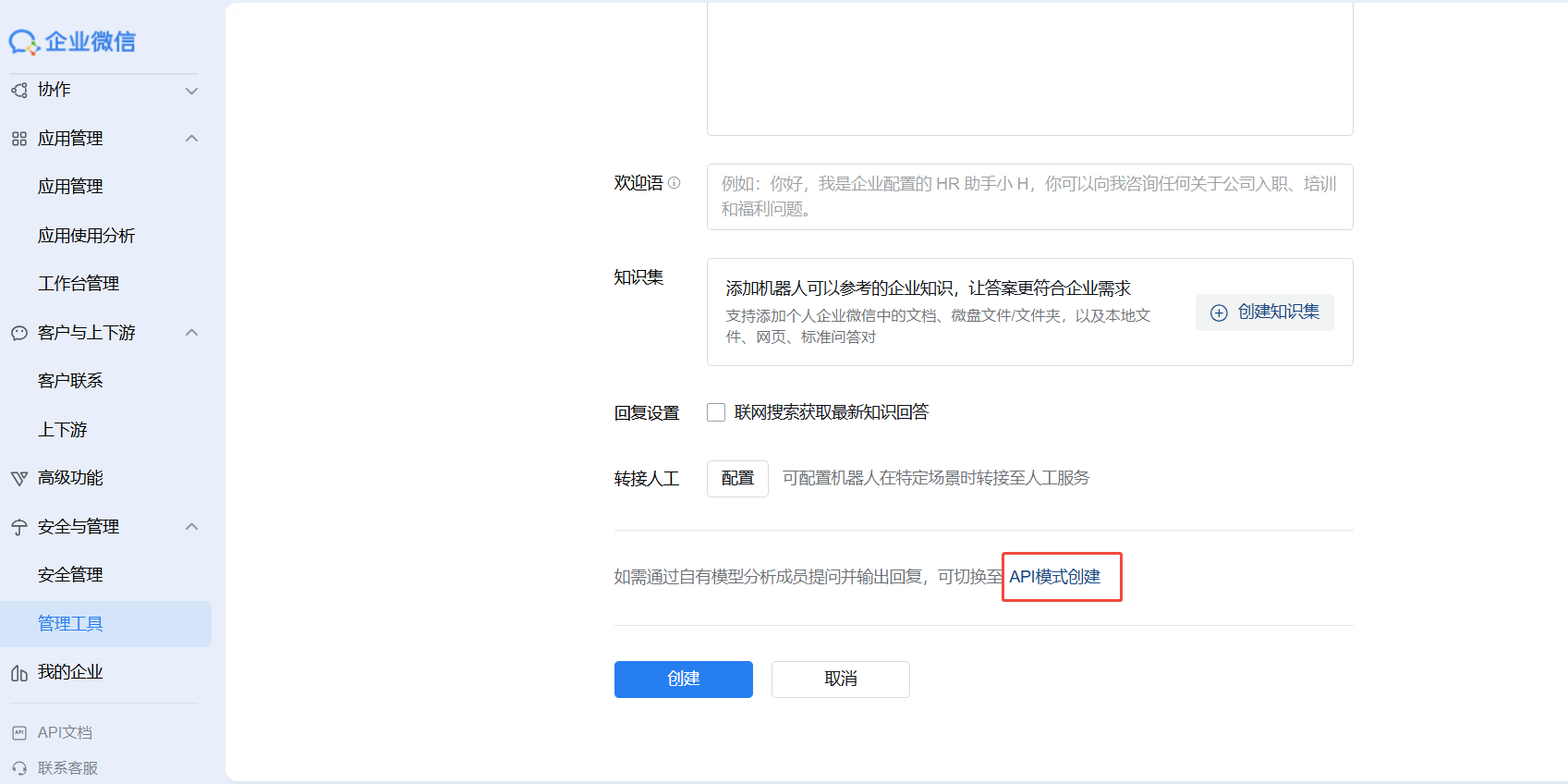 2. 下拉智能机器人创建页面至底部,点击【API模式创建】。