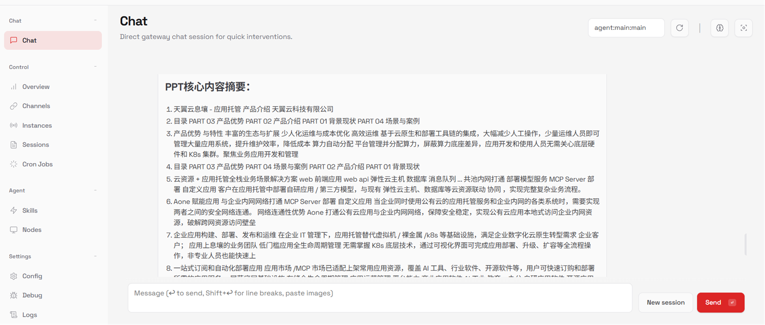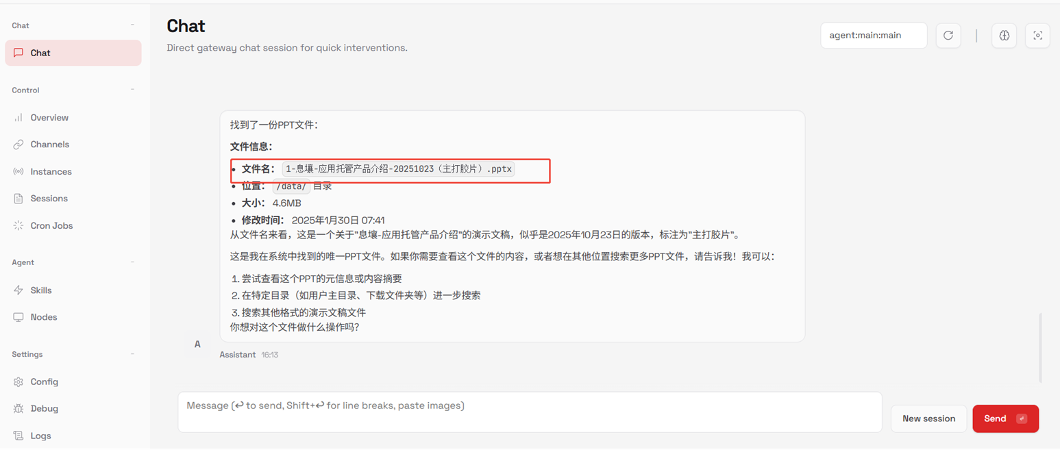 1.连接OpenClaw,在【chat】对话框中输入“请帮我查询应用托管产品介绍PPT”。OpenClaw可找到目标文件,且所在目录与挂载路径一致。