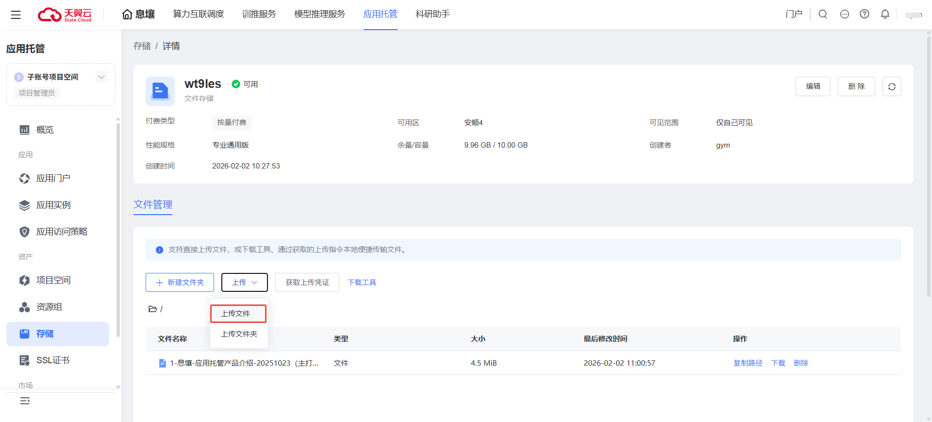 在存储列表查询到已创建的存储,点击目标存储名称,进入存储详情。在存储详情->文件管理,单击按钮【上传】->【上传文件】,完成目标文件上传至存储。