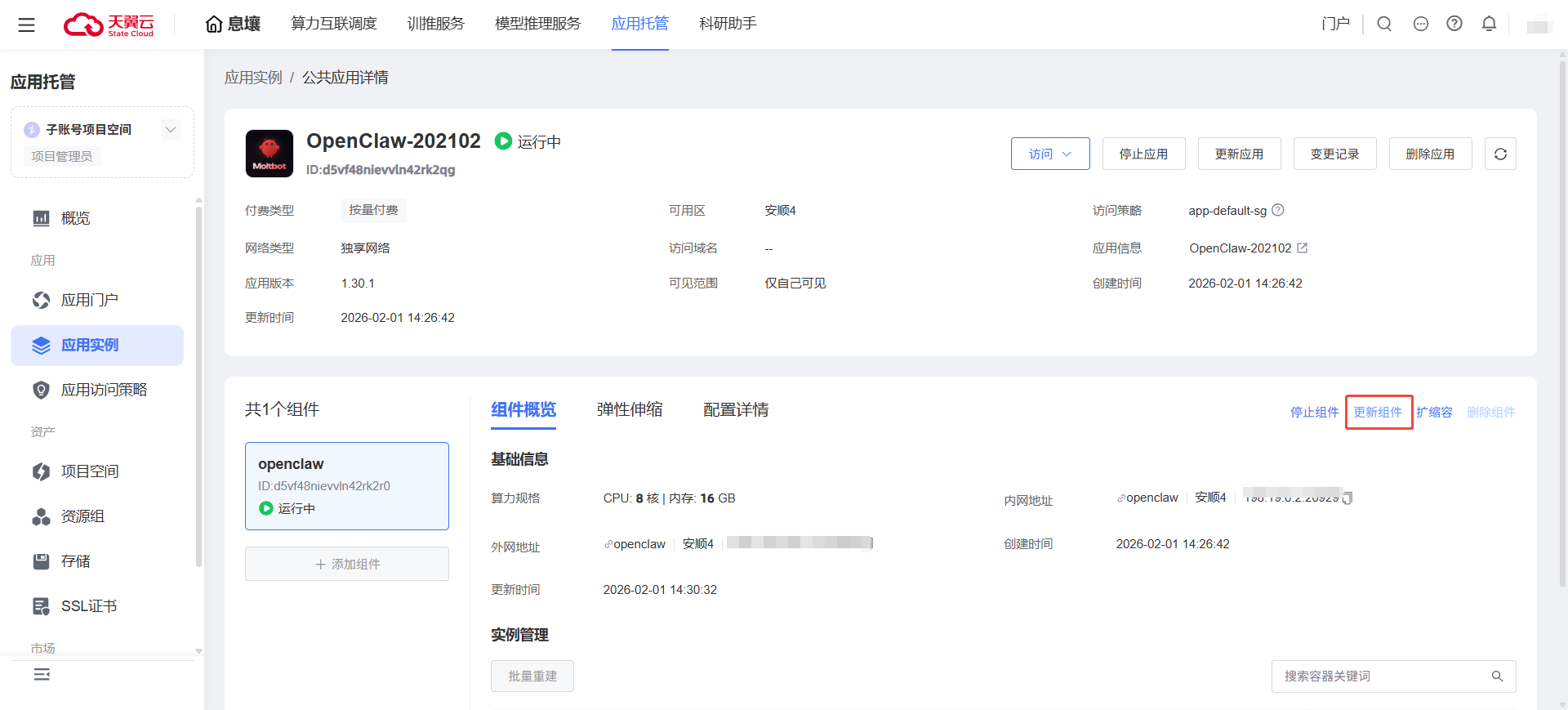 1.在左侧导航栏单击【应用】->【应用实例】,点击OpenClaw实例名称,进入实例详情。点击【更新组件】按钮。