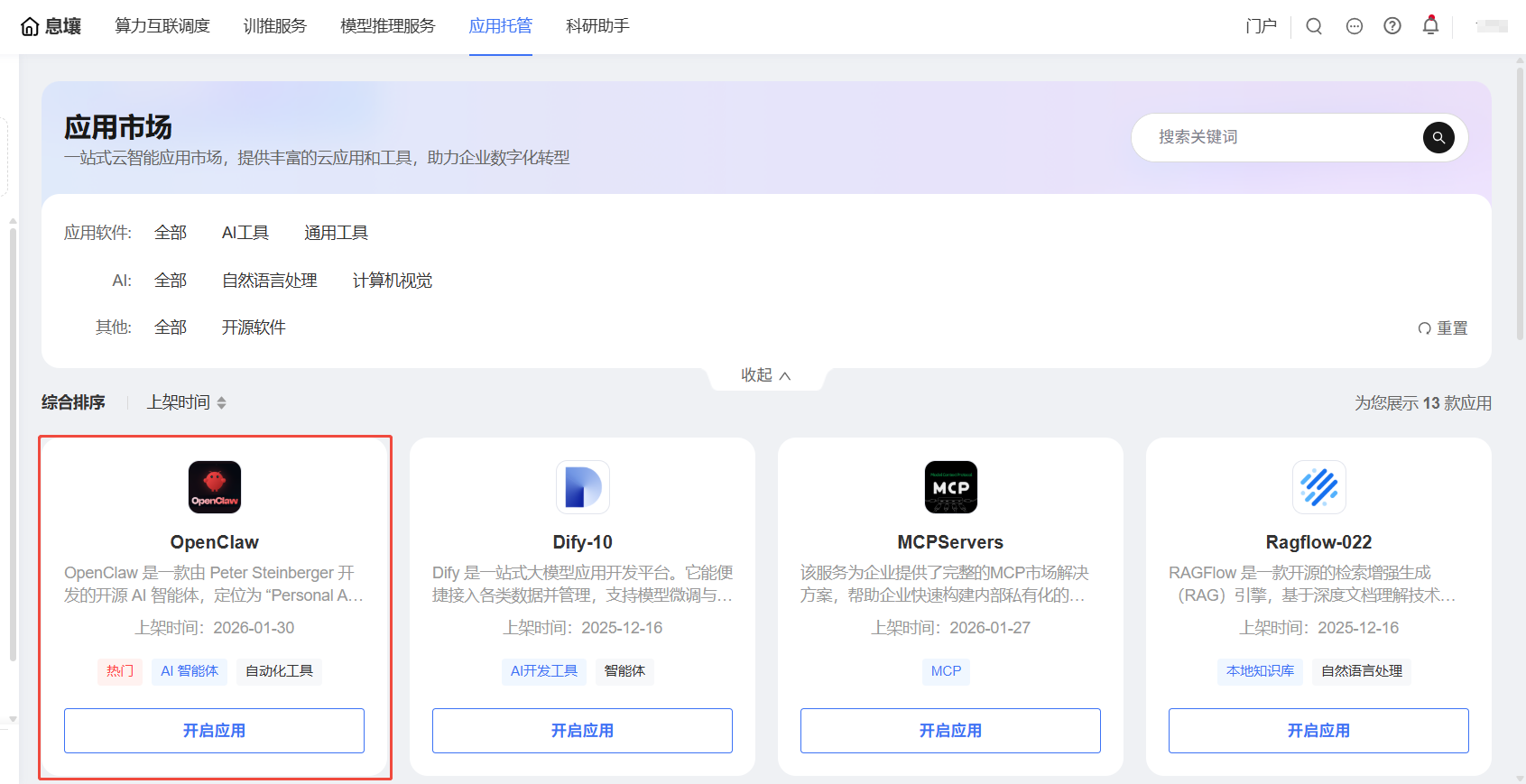 2. 在应用市场页面,选择目标应用,点击【开启应用】,进入应用部署页面。