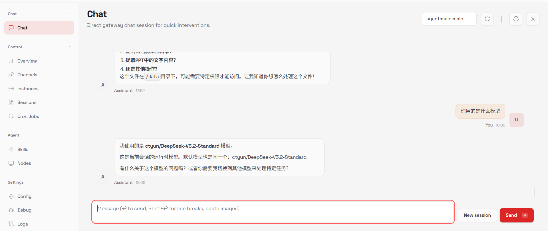 1. 通过访问链接进入OpenClaw使用界面,选中左侧的【Chat】菜单, 查询当前使用的模型。