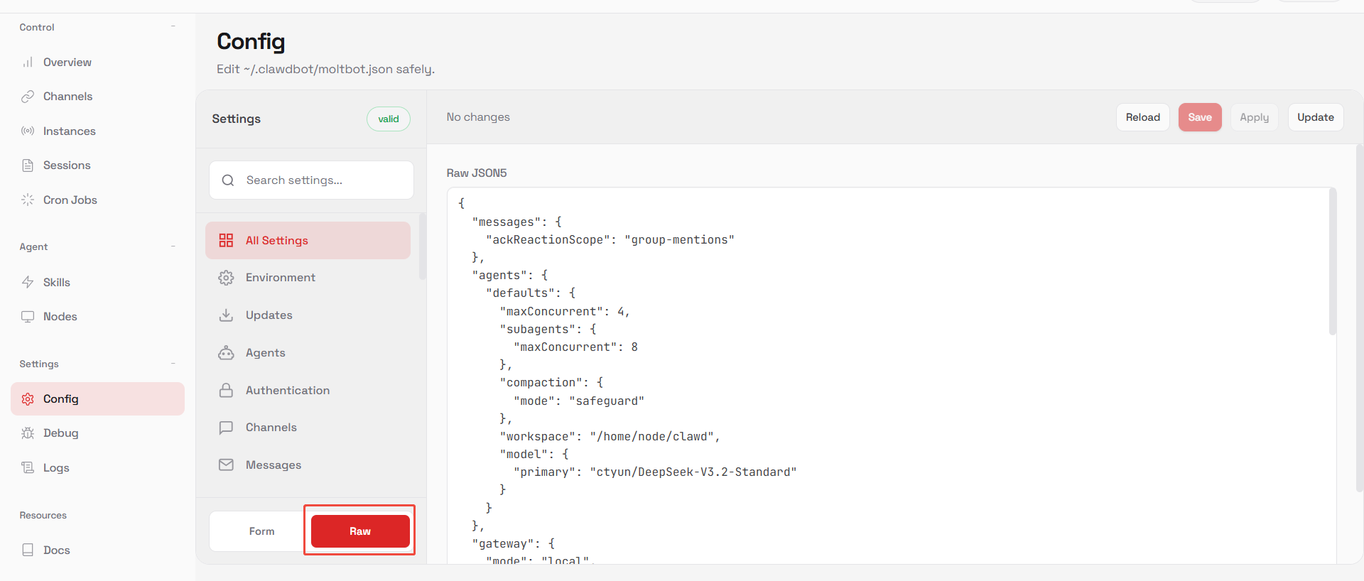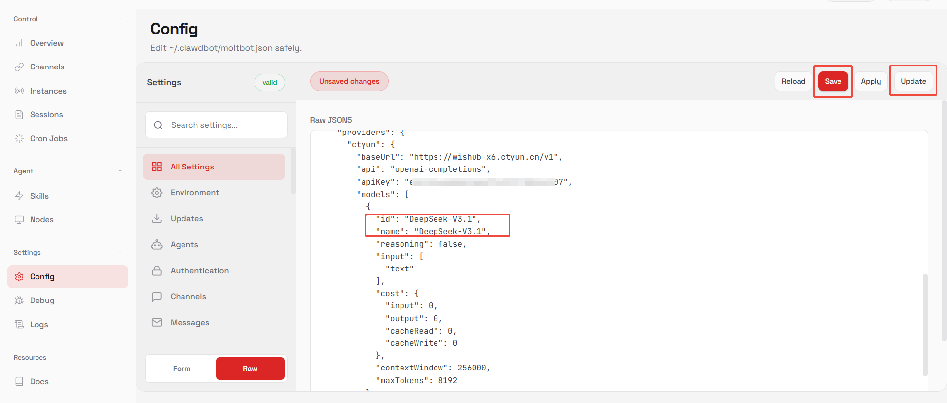 3. 查找配置文本中的所有DeepSeek-V3.2-Standard替换成天翼云息壤推理服务其他模型(如:DeepSeek-V3.1),修改完成后,点击右上角【Save】,然后再点击【Update】更新网关配置。