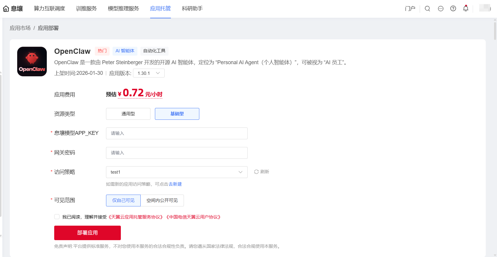 3. 填写获取的天翼云息壤模型推理服务APP KEY,设置OpenClaw的网关密码(用于连接OpenClaw网关),选择访问策略,勾选同意用户协议,点击【部署应用】,即可完成OpenClaw应用服务部署。