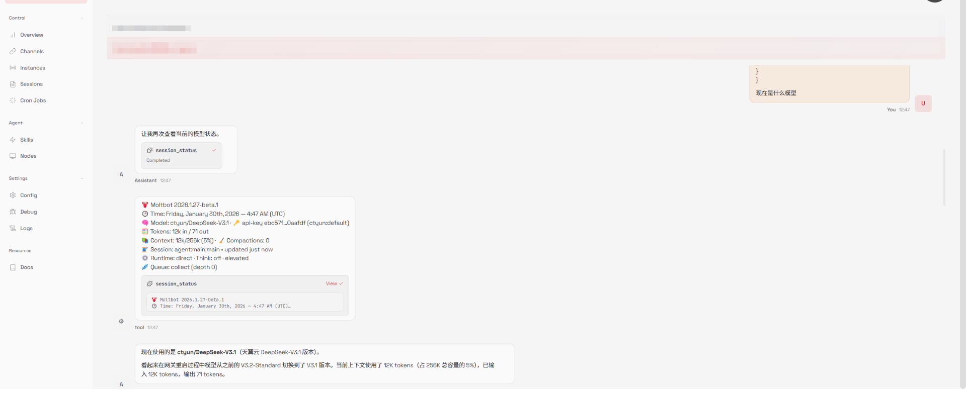 注意:替换前请确认已在天翼云息壤模型推理服务中添加目标模型(如:DeepSeek-V3.1),步骤参考 获取大模型API Key。