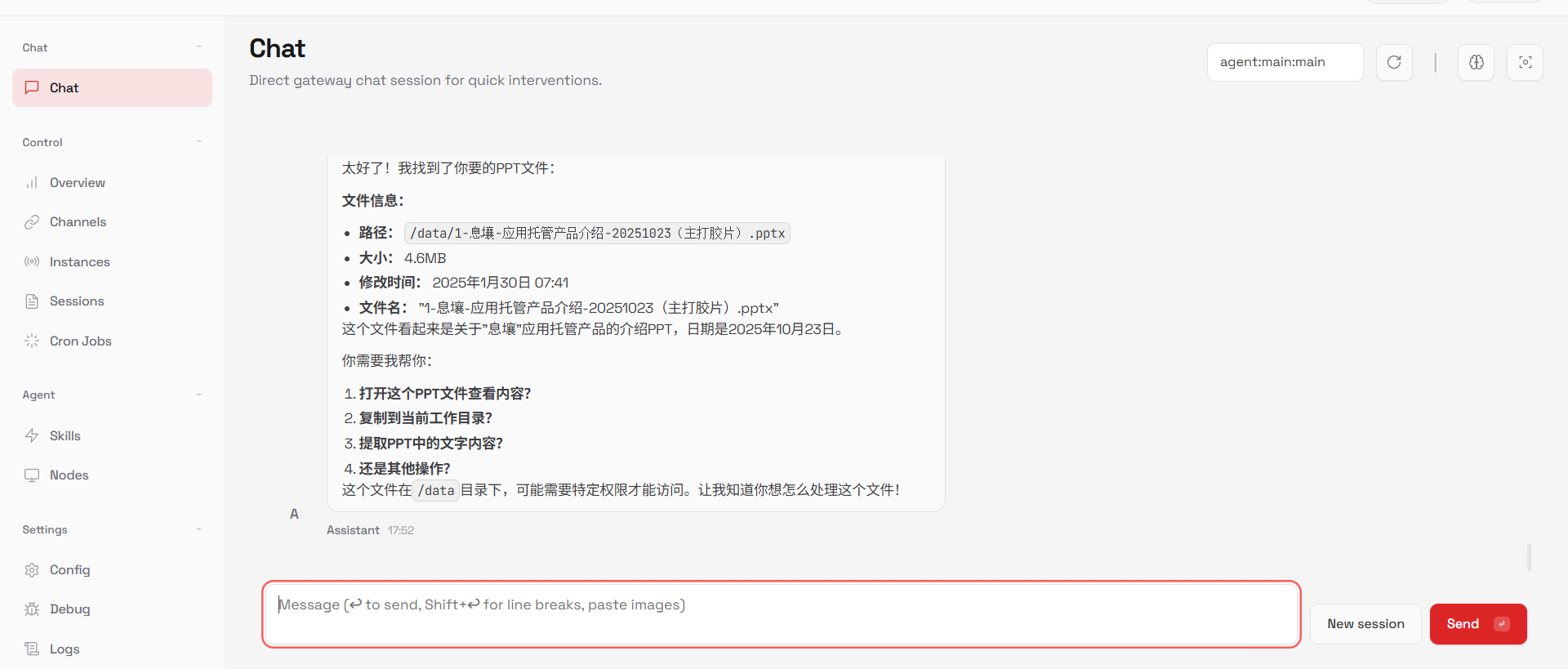 3. 点击左侧【Chat】菜单,即可与OpenClaw进行交互。