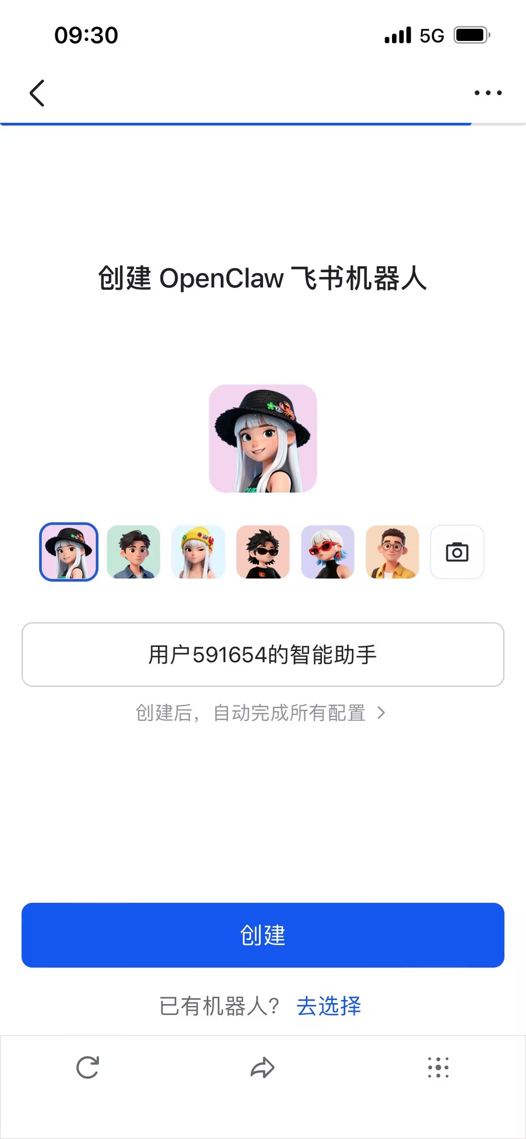 2.扫描二维码打开飞书,创建OpenClaw飞书机器人,可选择头像设置名称。