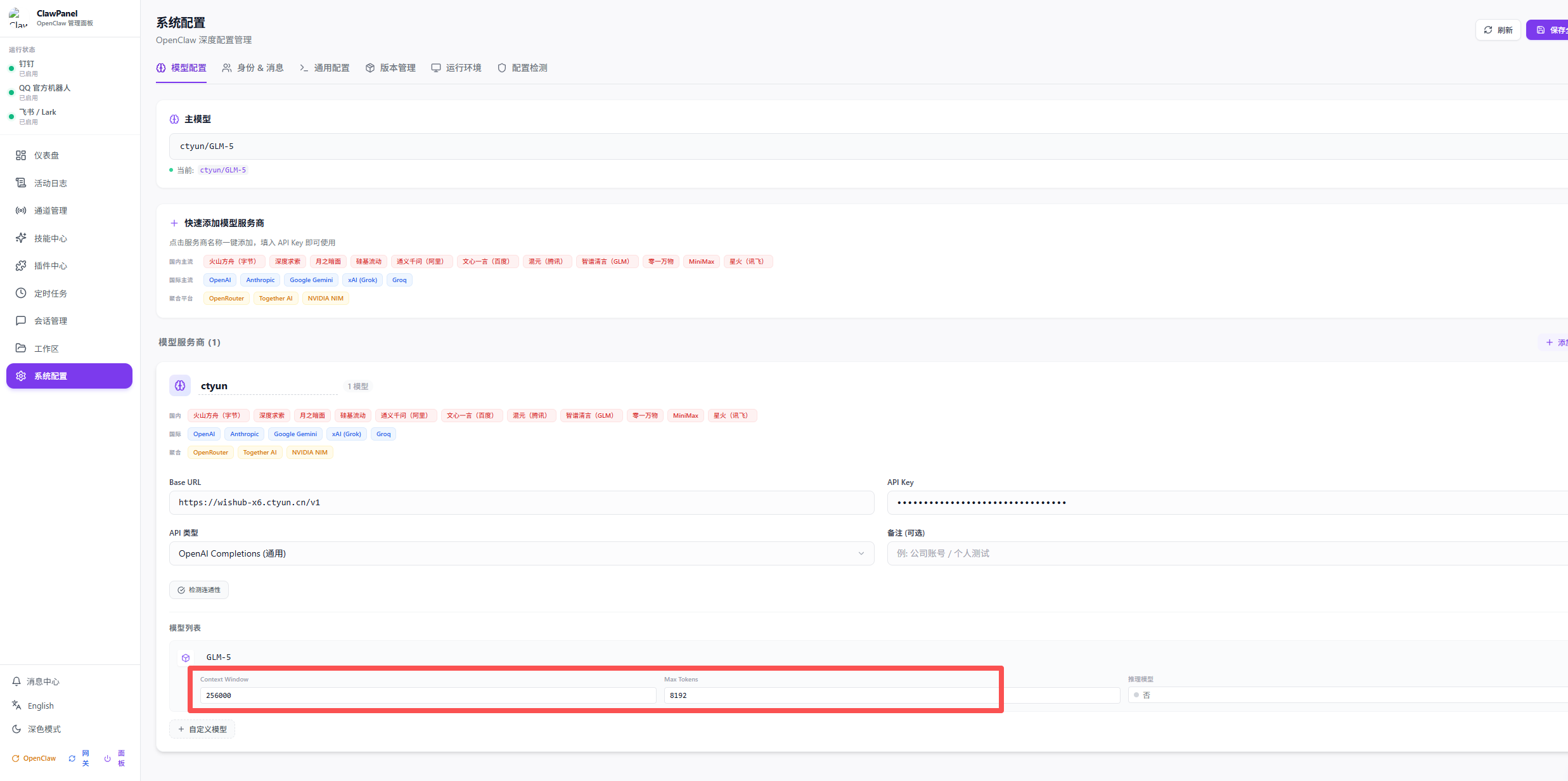 示例:若您添加的模型为GLM-5,上下文长度:200k tokens(输出长度上限为128k)。